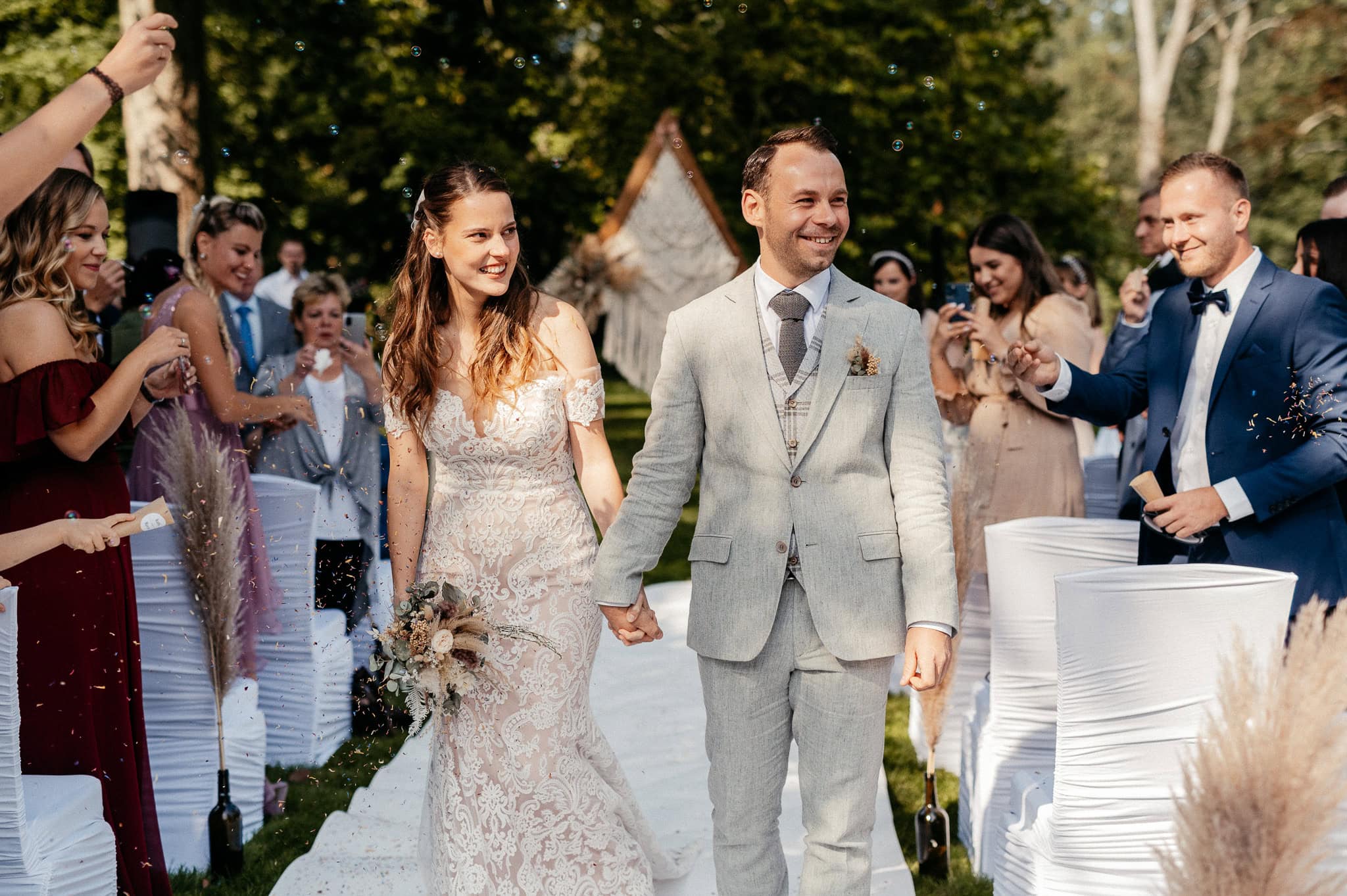 Die beiden haben ganz im Boho-Stil geheiratet. Und was sollen wir sagen: Sie haben alles gegeben. So viel Liebe zum Detail – wirklich der Oberkracher. Wir waren komplett verliebt in die vielen kleinen Dinge, die diese Hochzeit so besonders gemacht haben.