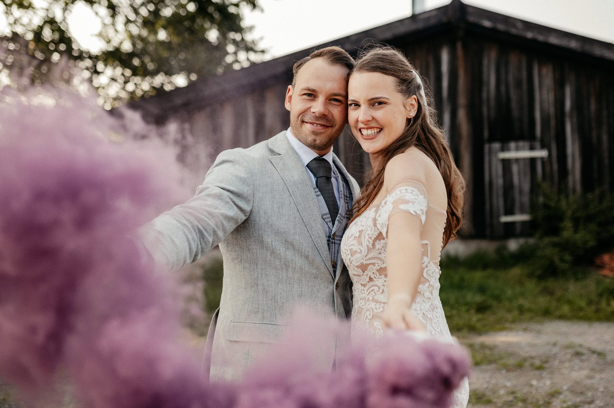 Das Hochzeitspaar-Shooting war unser persönliches Highlight des Tages. Kathi und Marcel hatten einen ganzen Karton voller Rauchbomben dabei. YAY! Wir haben es so gefeiert. Die beiden hatten riesigen Spaß und wir konnten unglaublich emotionale und kreative Momente einfangen.