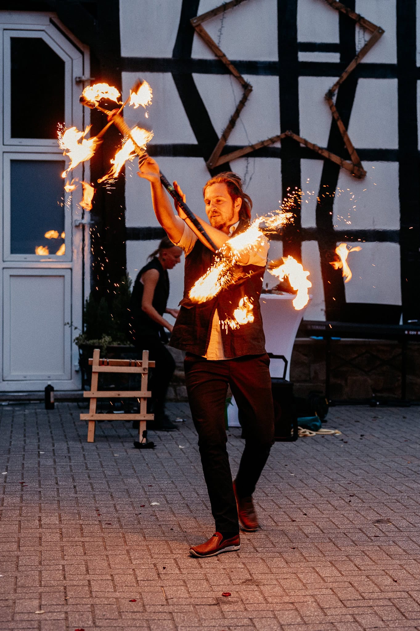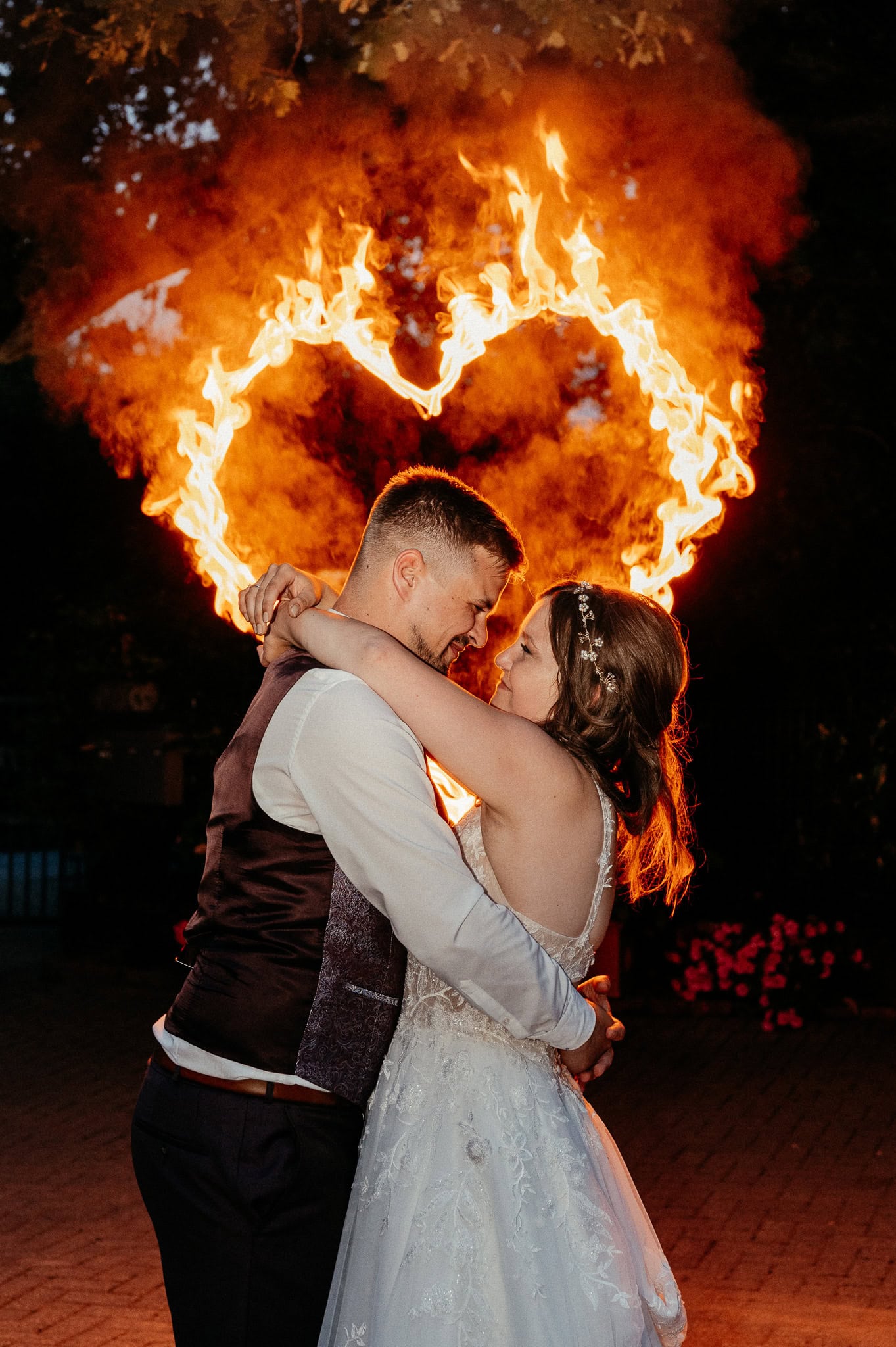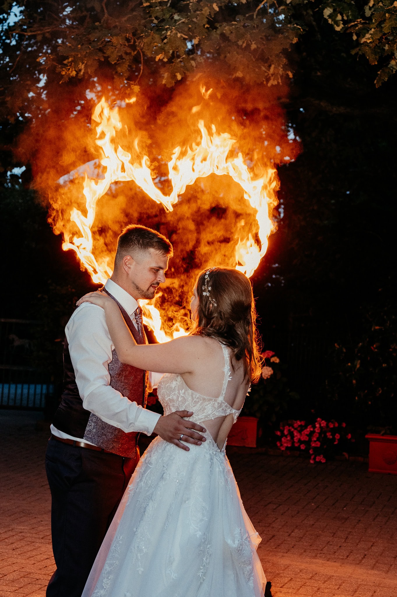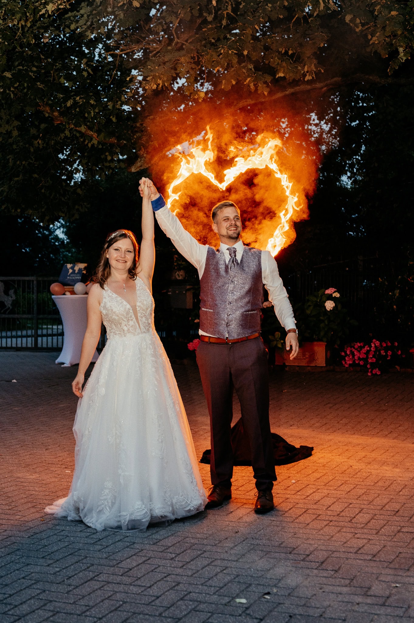 Nach der Trauung kam dann die nächste Gänsehaut-Attacke. Diese Trauung hatte ganz viel Herz, Humor und Persönlichkeit! Sabrinas Freundin, die eine unglaubliche Stimme hat, sang für das frisch vermählte Paar. Es war einer dieser Gänsehaut-Momente, in denen die Zeit kurz stillzustehen schien. Danach ging es über in eine Feier, die kaum abwechslungsreicher hätte sein können. Eine Feuershow brachte den Abend zum Leuchten, eine Bauchtanzgruppe verzauberte die Gäste mit anmutigen Bewegungen und das große Finale, ein brennendes Feuerherz, was den Nachthimmel in warmem Licht erstrahlen ließ.
