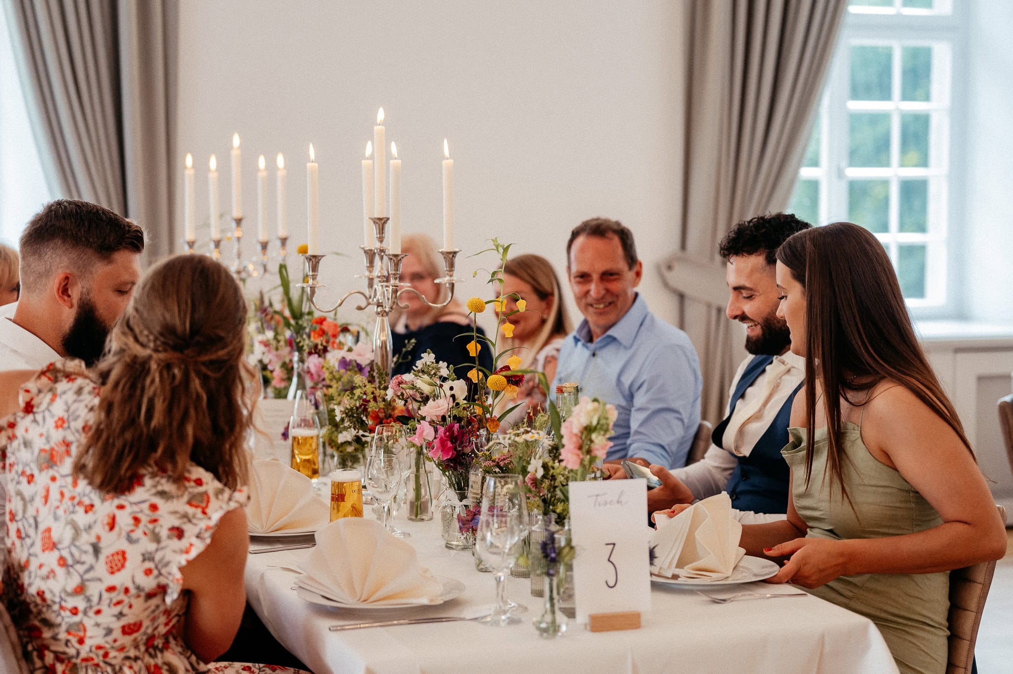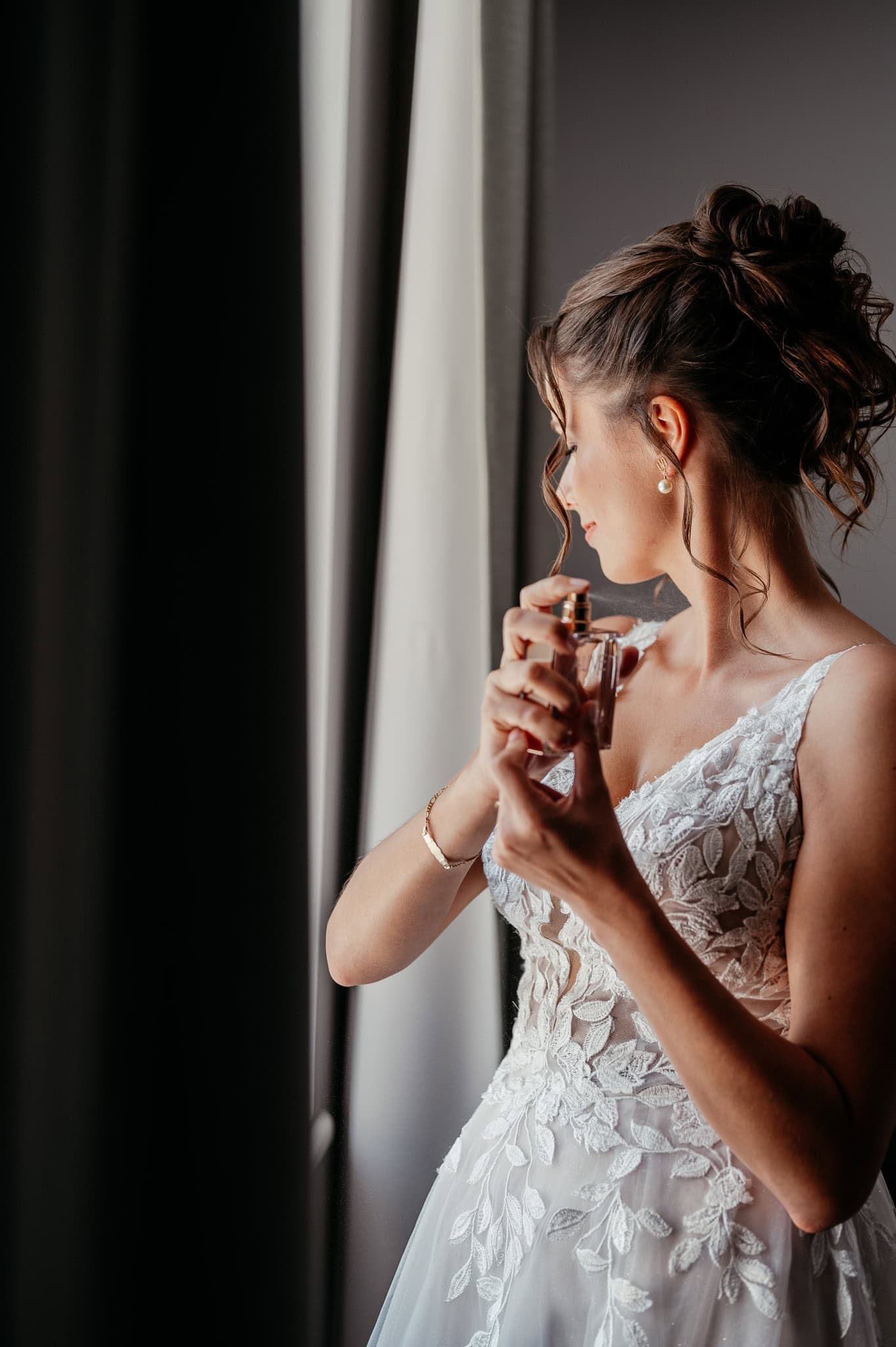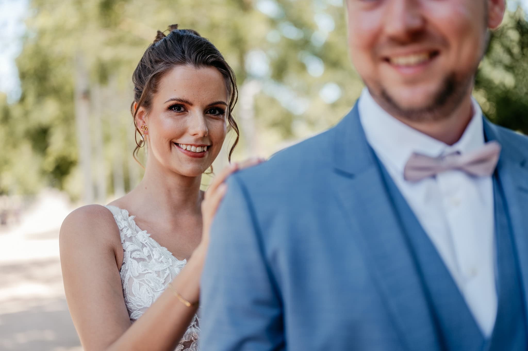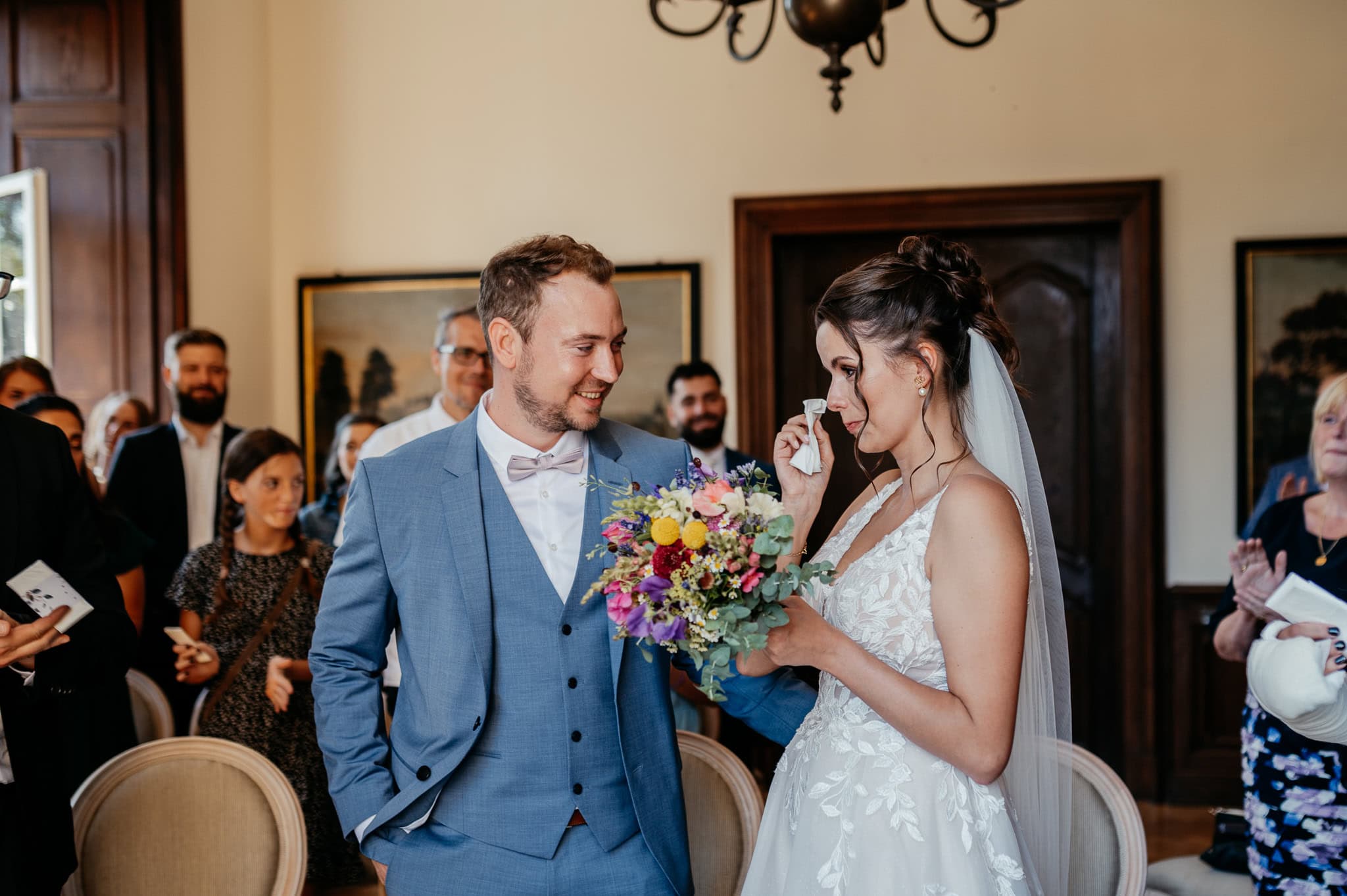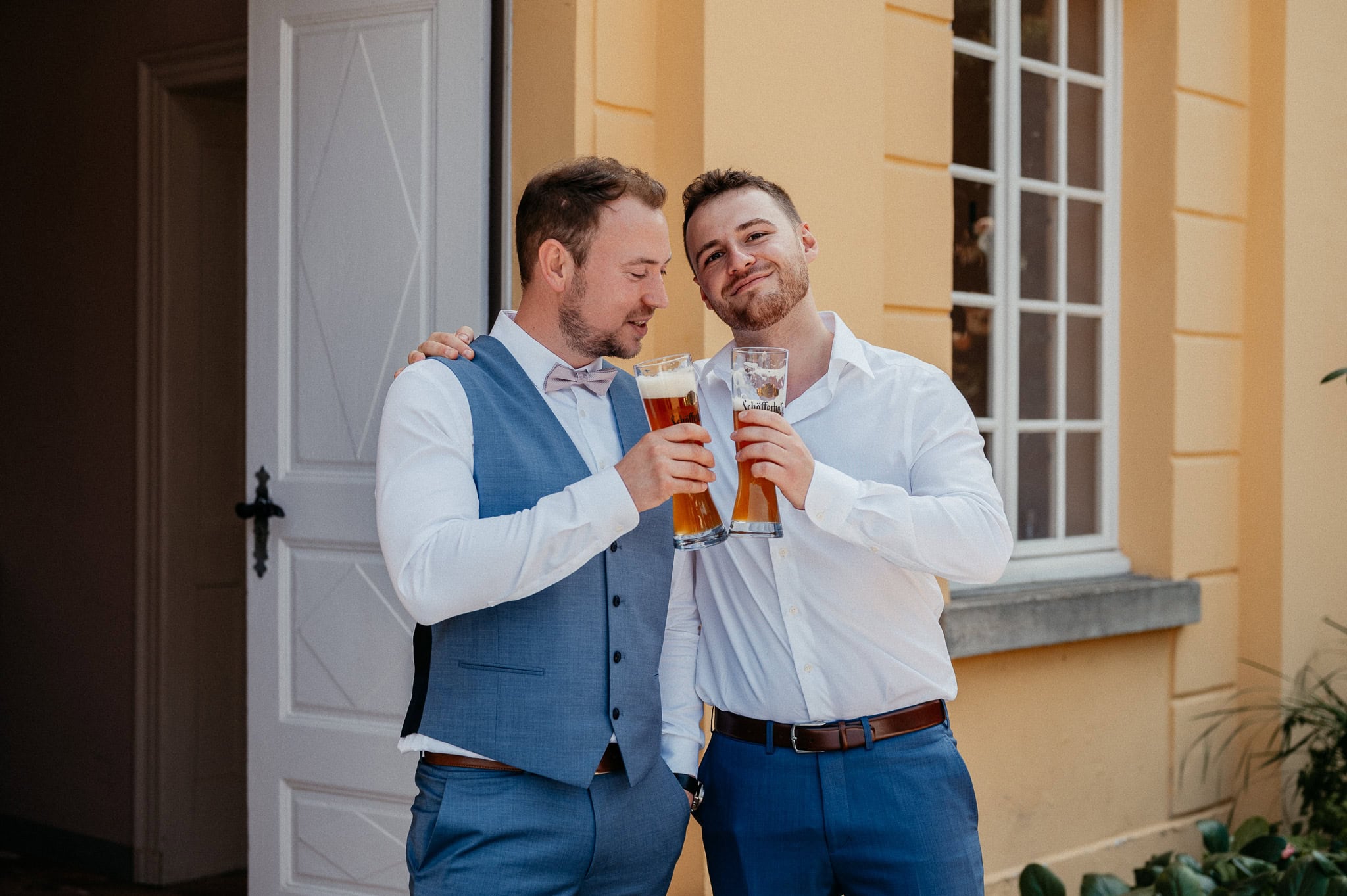 Gestartet haben wir an diesem besonderen Tag unseres Hochzeitspaares mit einem Getting Ready. Die zwei haben vor Ort im Schloss übernachtet und konnten somit entspannt in den Tag starten. Die Trauung war vor Ort im Standesamt, der Sektempfang im Teehaus und die Feier im Schloss. Wenn alles an einem Ort stattfindet, ist es für alle Beteiligten super entspannt.