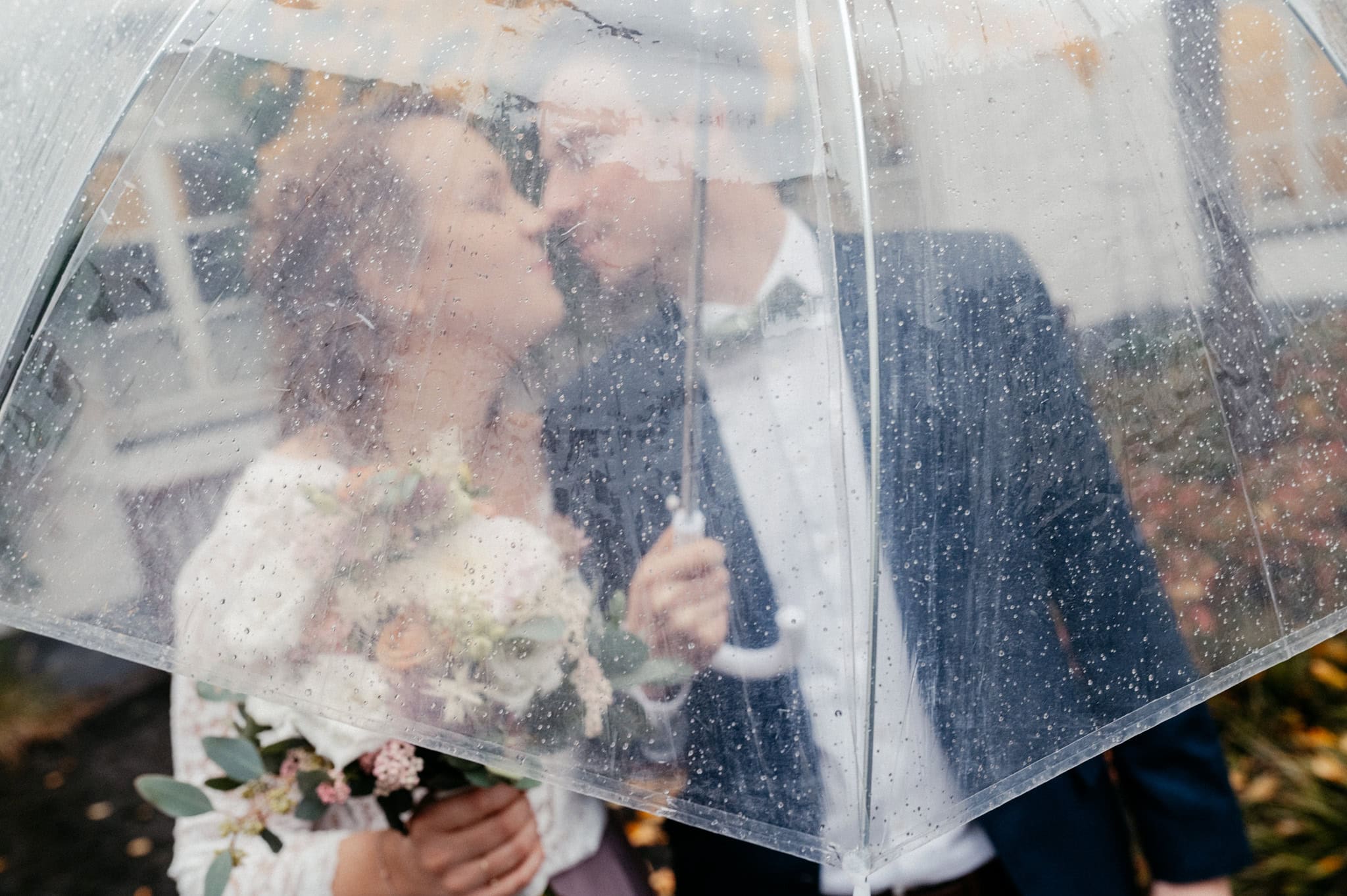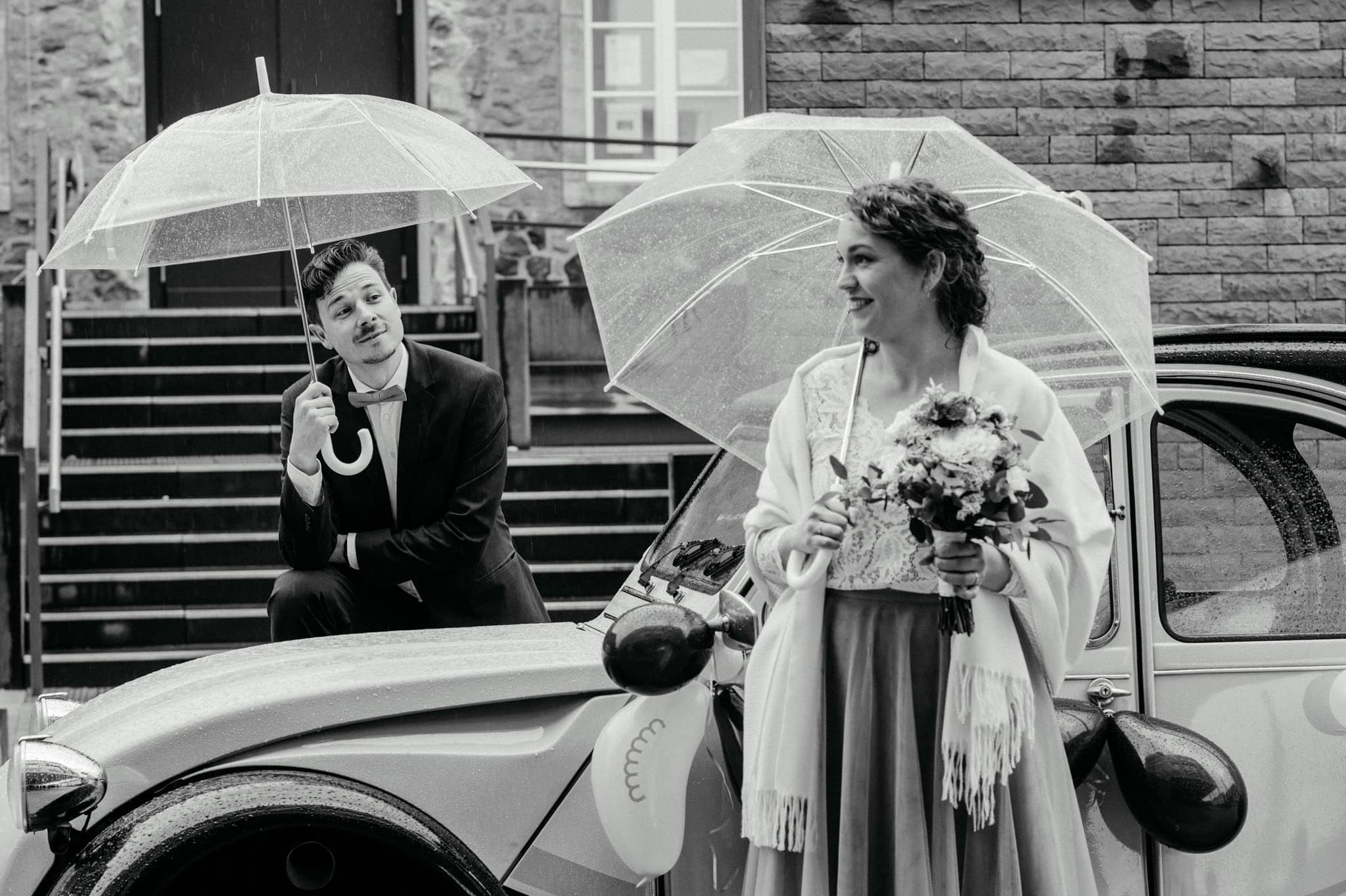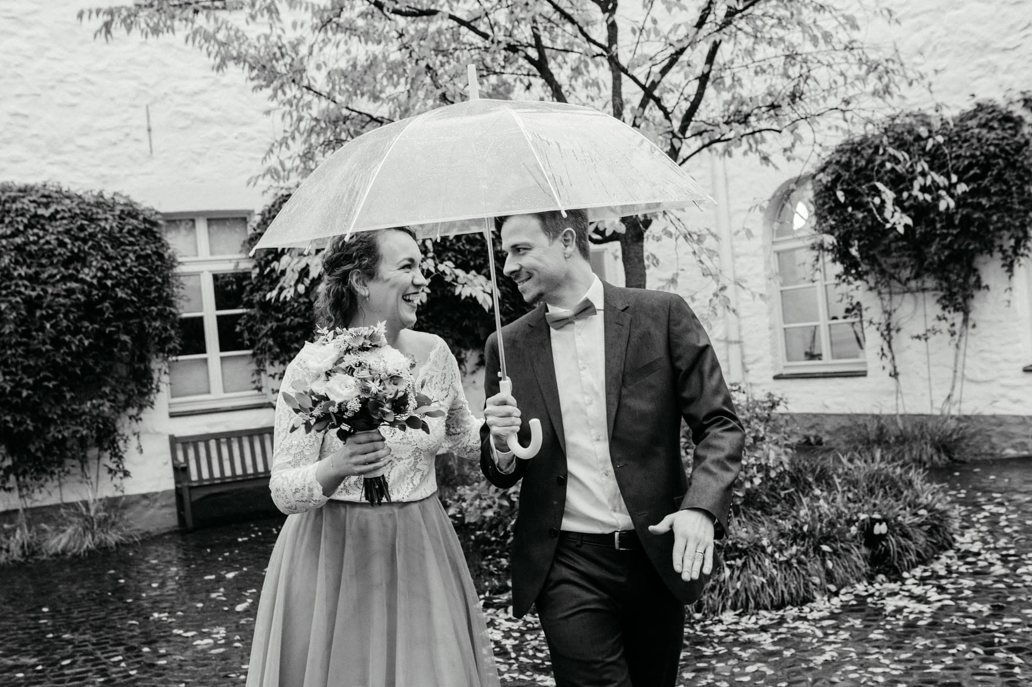 Als Hochzeitsfotografen sind wir immer vorbereitet. Wir haben grundsätzlich zwei durchsichtige Schirme mit an Board, die wir gerne mit zu Eurer Hochzeit bringen. Sie sind neutral, zeitlos und perfekt für natürliche Regenbilder.