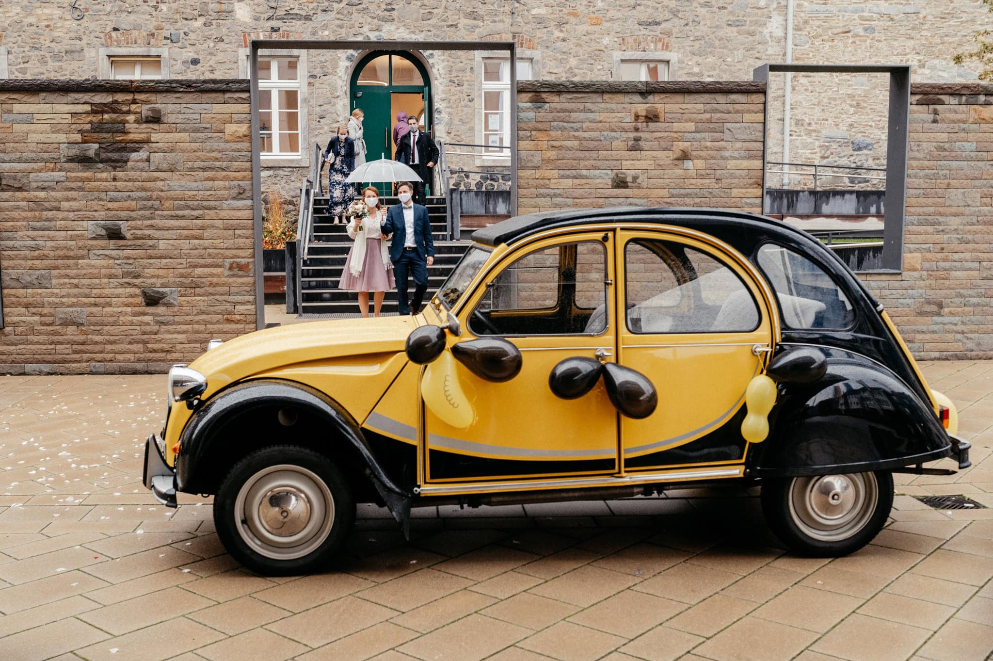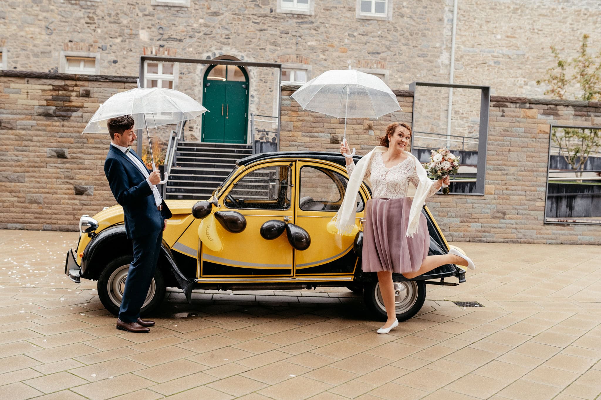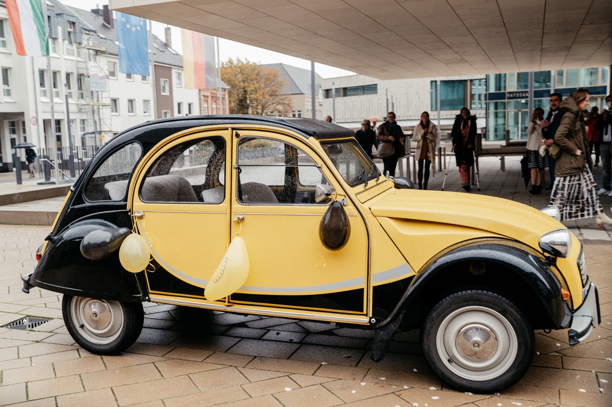 Das persönliche Highlight des Tages war diese bezaubernde schwarz-gelbe Ente, mit der die beiden vom Standesamt Ratingen abgeholt wurden. Nein – keine BVB-Ente. Sondern die Farben ihres Basketballvereins. Solche Details lieben wir.