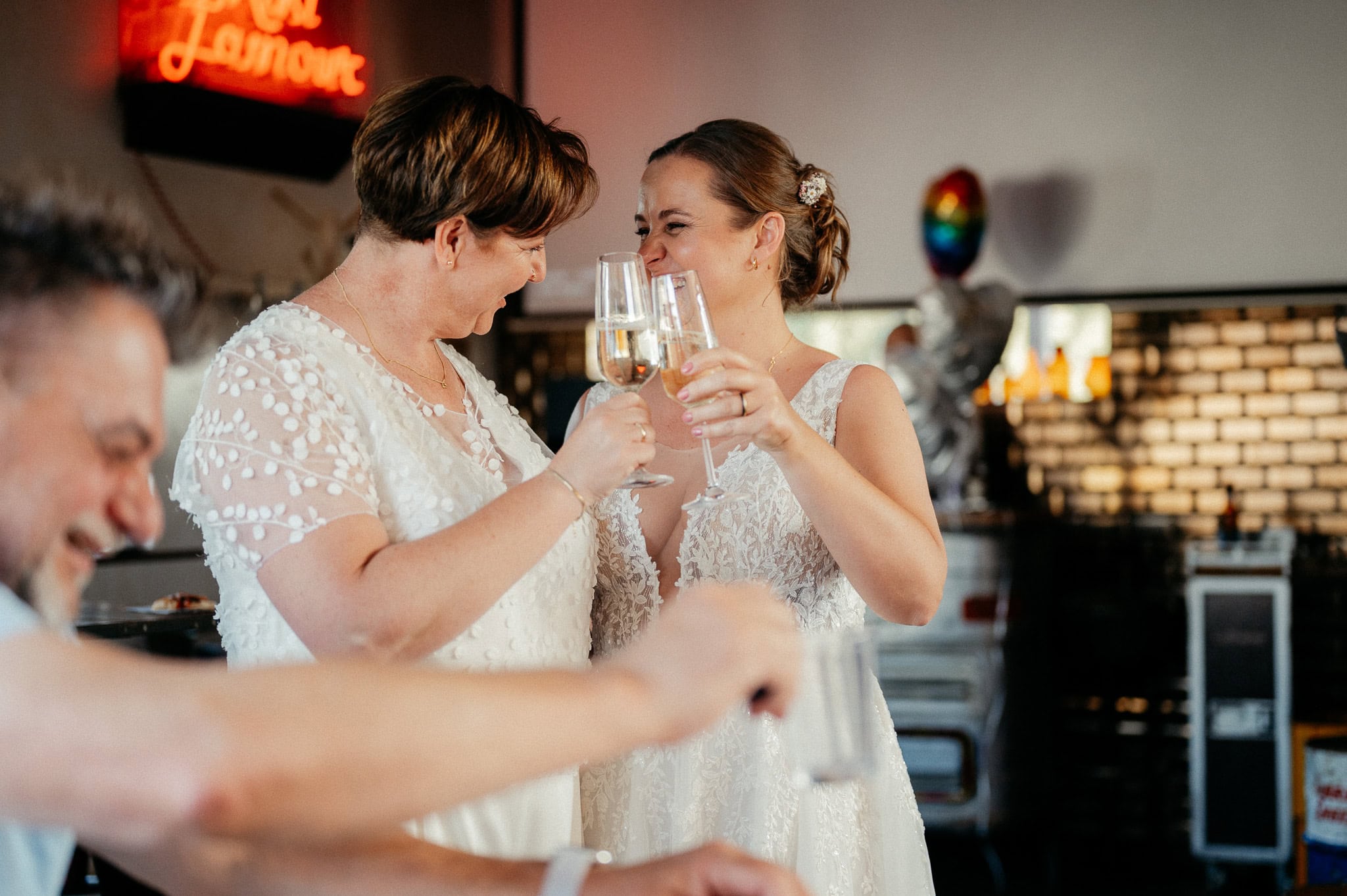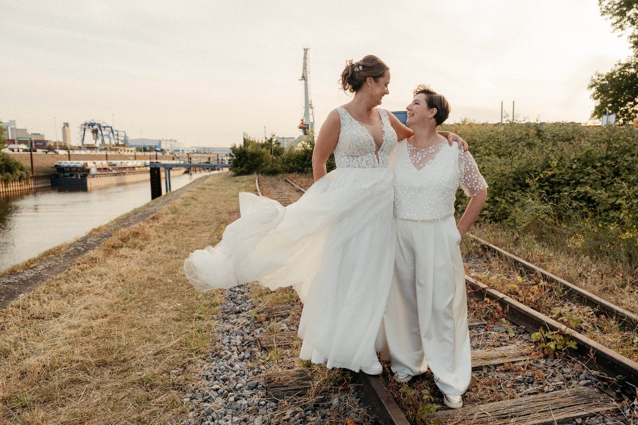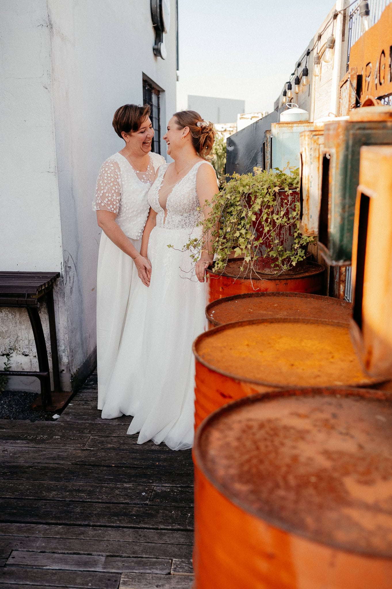 Besonders schön war für mich auch der persönliche Bezug. Bereits im Jahr zuvor durfte ich die Hochzeit des besten Freundes einer der Bräute fotografieren. Auch Hendrik ist Teil der LGBTQ+ Community. Beide Hochzeiten fanden in derselben Location statt – der Garage im Hafen Neuss (Am Hochofen).