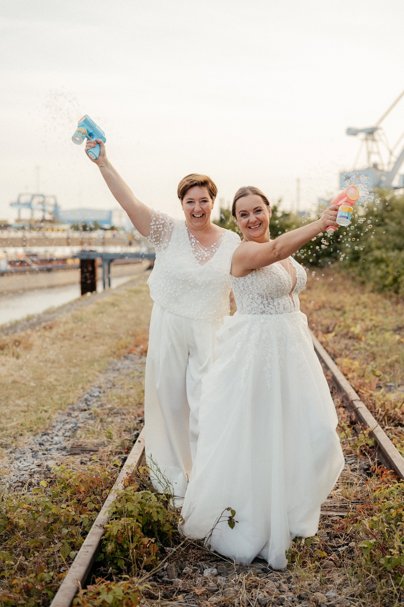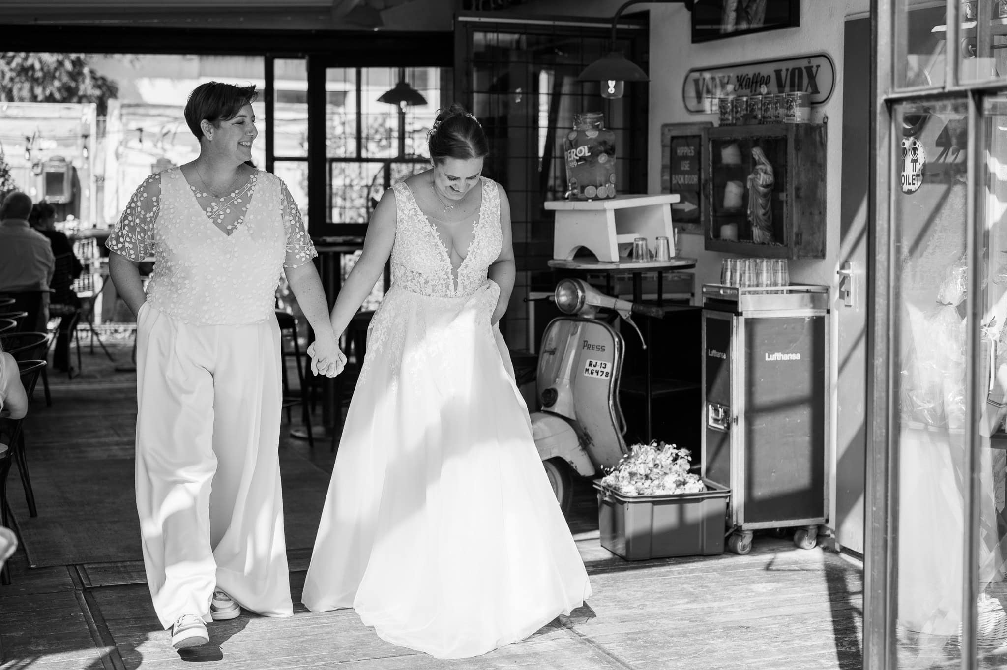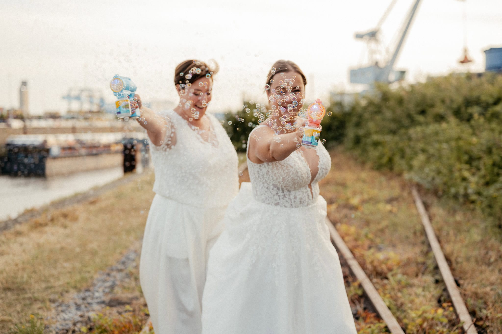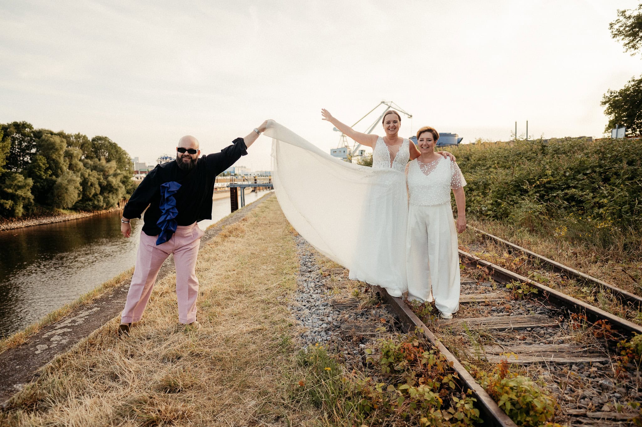 Besonders schön war für mich auch der persönliche Bezug. Bereits im Jahr zuvor durfte ich die Hochzeit des besten Freundes einer der Bräute fotografieren. Auch Hendrik ist Teil der LGBTQ+ Community. Beide Hochzeiten fanden in derselben Location statt – der Garage im Hafen Neuss (Am Hochofen).