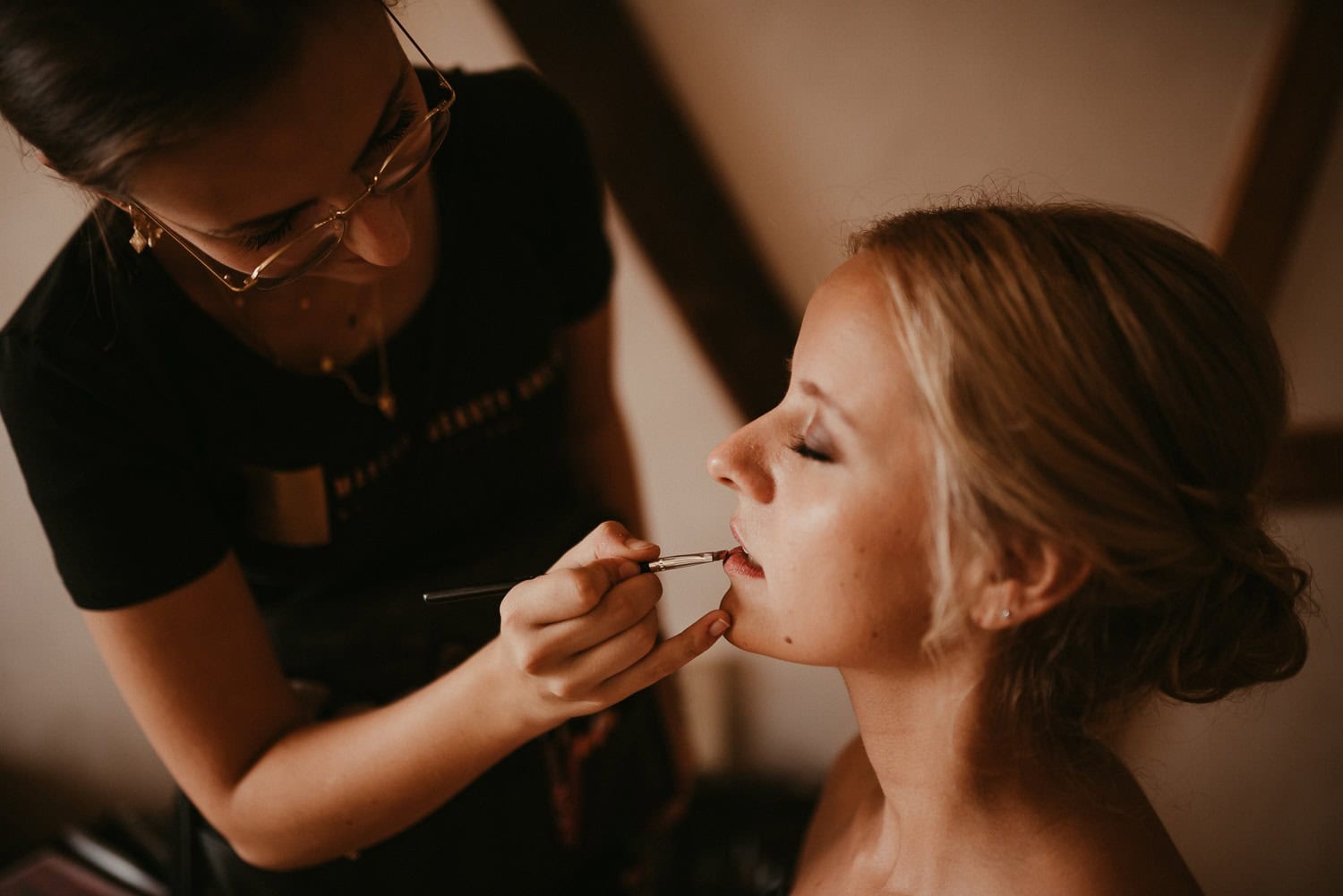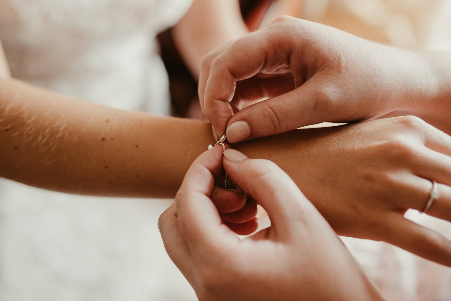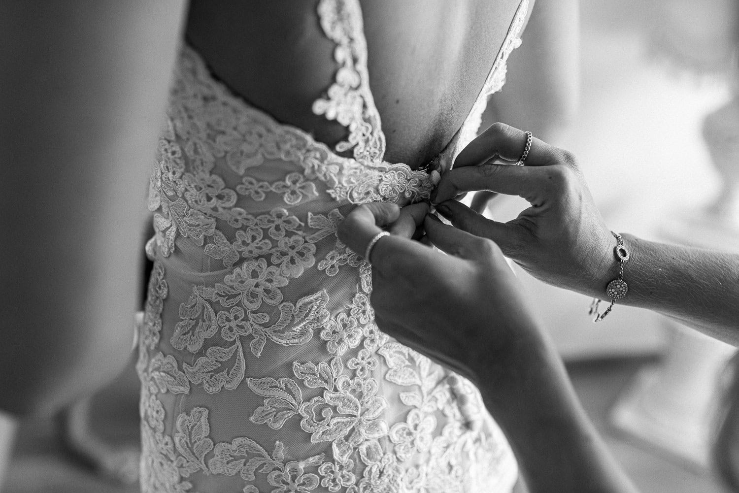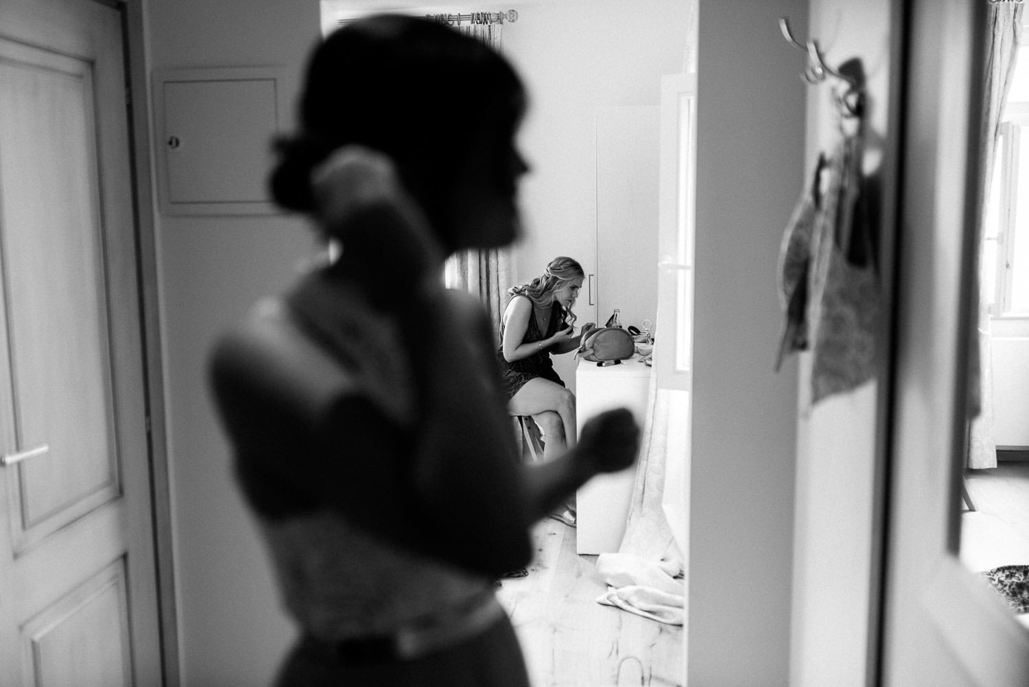 Gerade bei einer Hochzeitsreportage entstehen intime Momente: Beim Getting Ready, wenn die Braut noch leicht aufgeregt ist, wir sie kurz in den Arm nehmen und ihr sagen, wie wunderschön sie aussieht. Oder später am Abend, wenn wir uns auf der Toilette treffen, die Frisur noch einmal richten, beim Kleid helfen und kurz durchatmen.