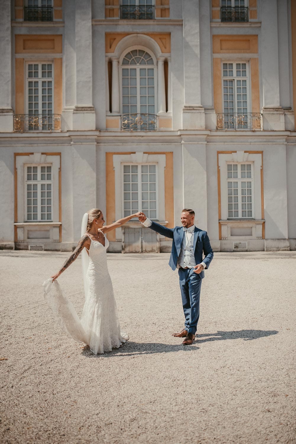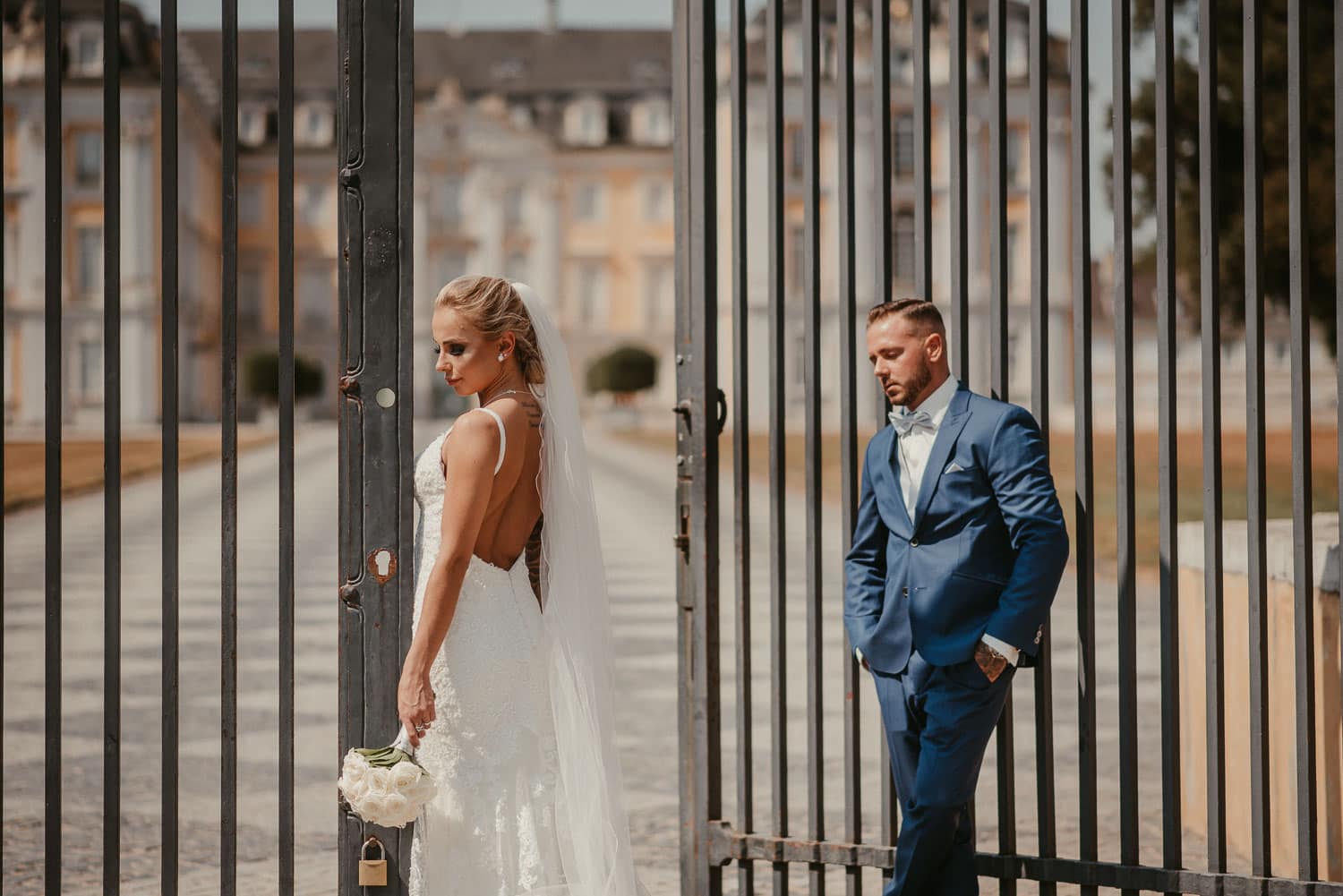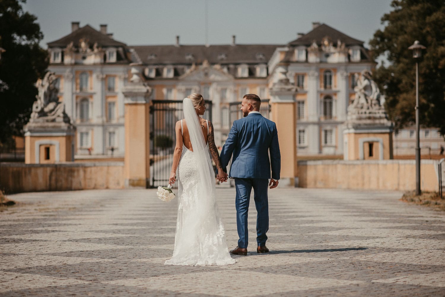 Für das Brautpaarshooting haben wir uns eine traumhafte Kulisse ausgesucht: das Gelände rund um das Schloss Brühl. Diese Location bietet nicht nur eine malerische Umgebung mit historischem Flair, sondern auch viele ruhige Ecken für intime Momente zu zweit. Genau das macht es so perfekt für emotionale Hochzeitsfotos.