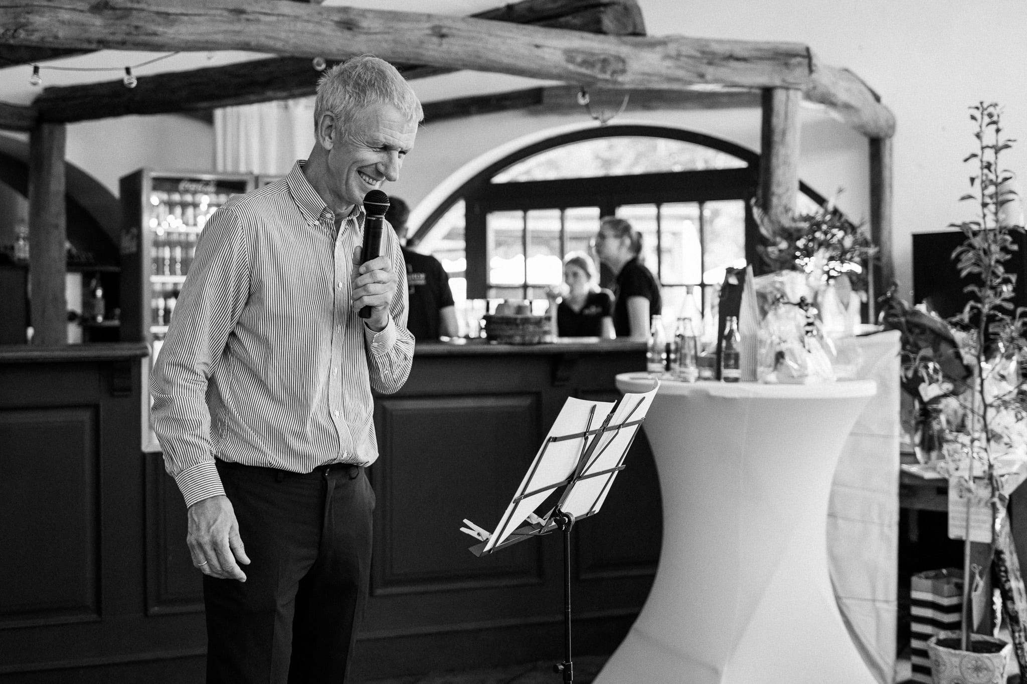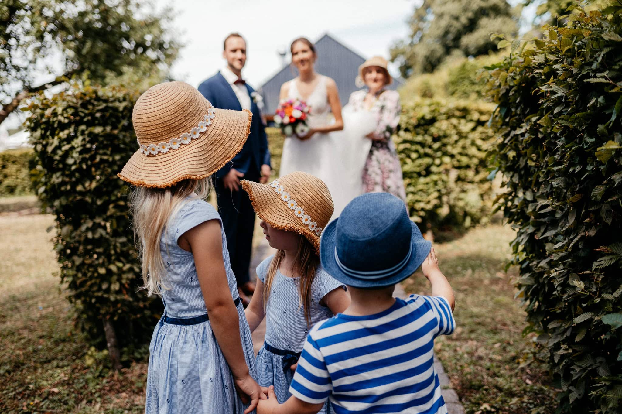 Die beiden waren tiefenentspannt und empfingen ihre Gäste noch vor der Trauung persönlich. Als alle da waren und Platz genommen hatten, zogen Judith und ihr Lukas zusammen mit drei süßen Blumenkindern und dem Pfarrer ein.