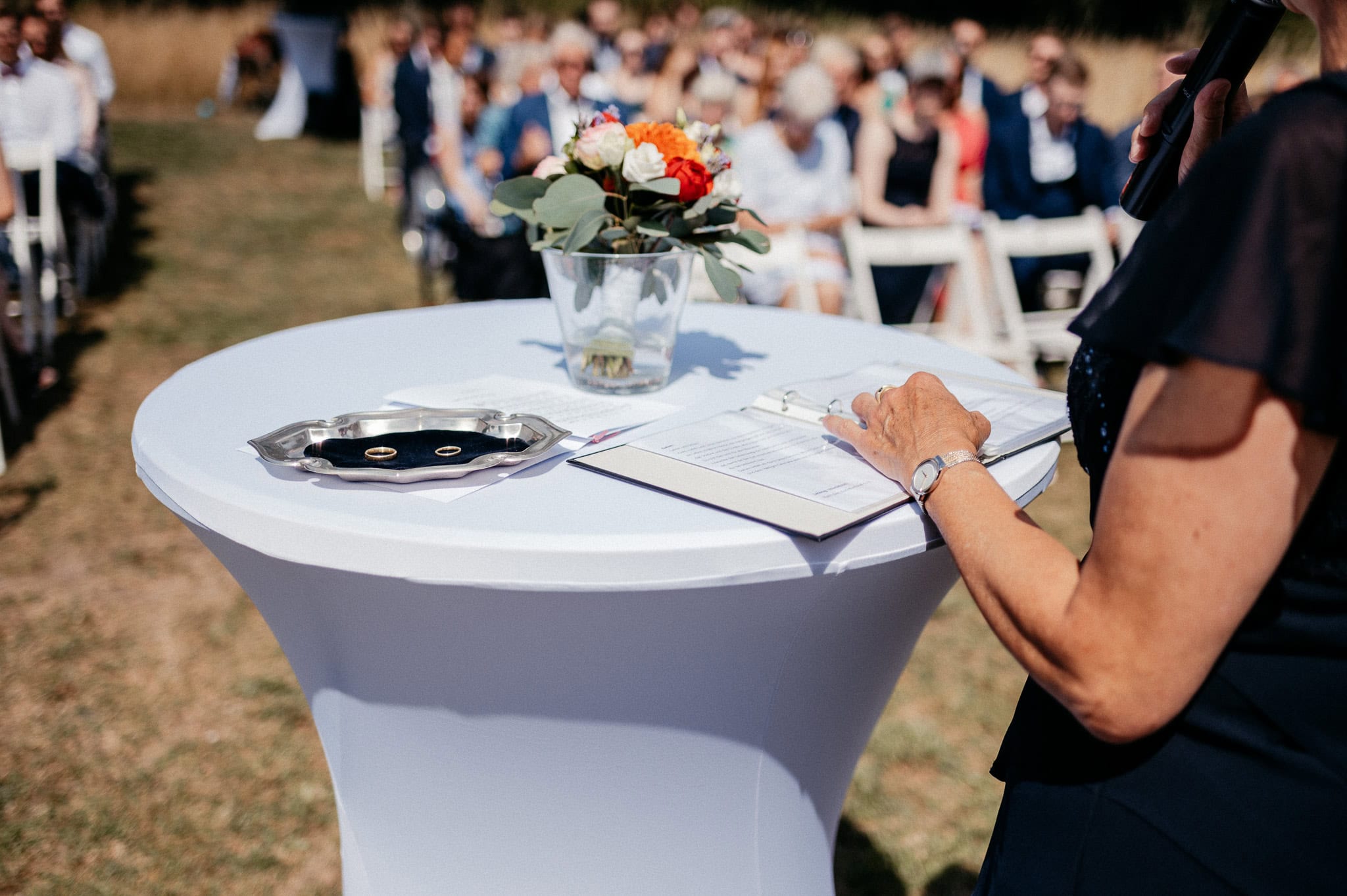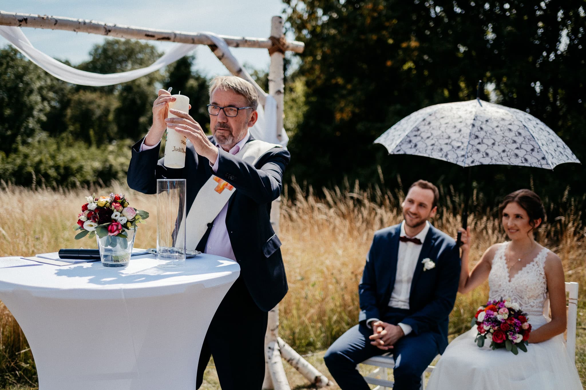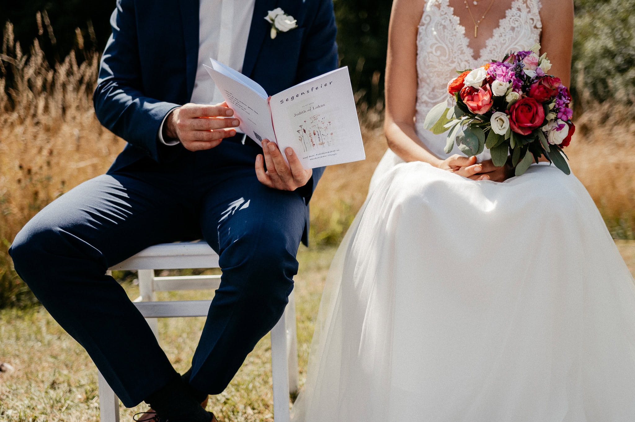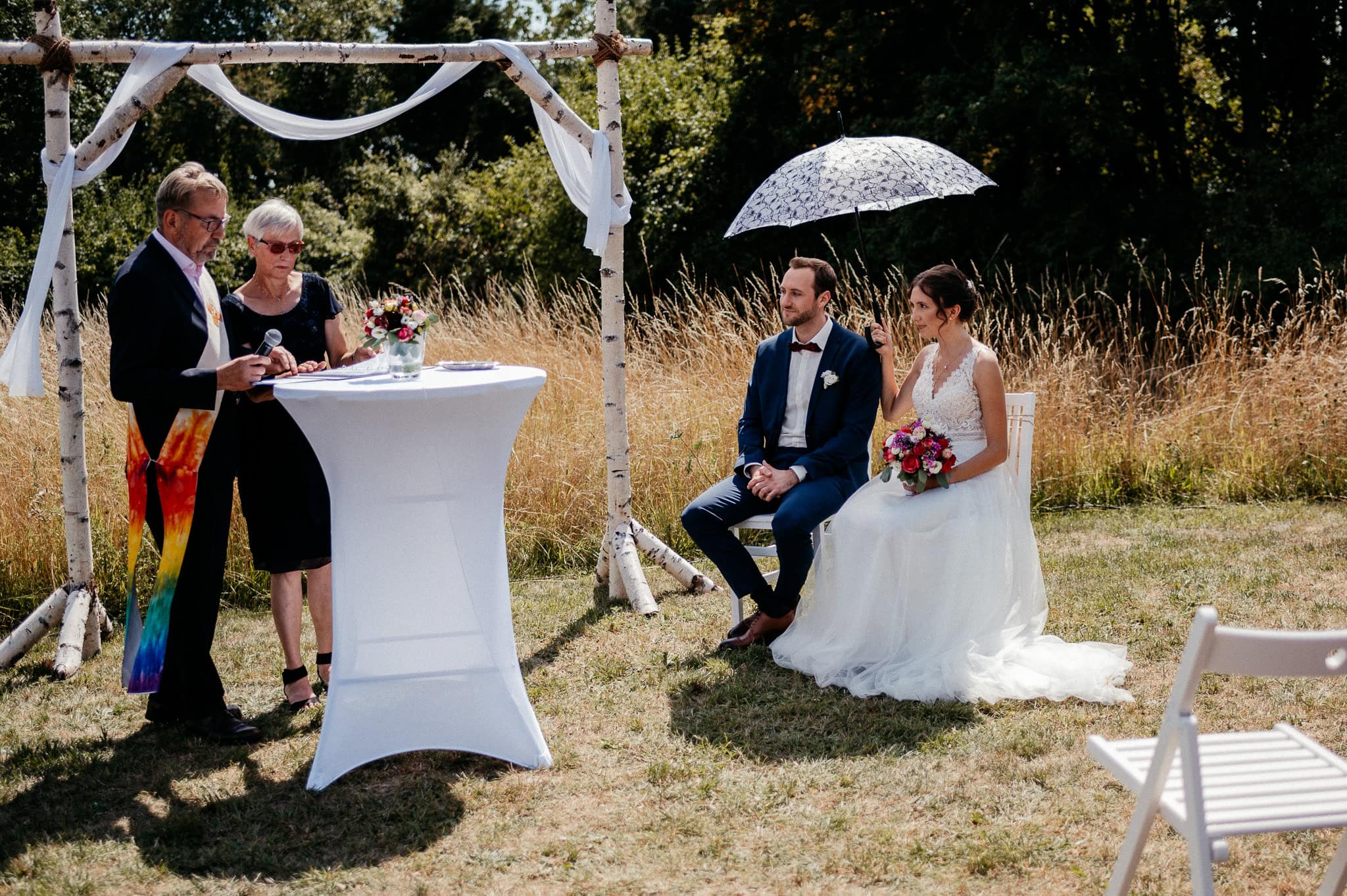 Die Trauung wurde musikalisch von Freunden und der Gitarre wunderschön untermalt und durch kleine, feine Rituale zu etwas ganz Besonderem. Einziges kleines Manko, das Wetter. Das war einfach ZU schön. Das Brautpaar „flüchtete“ sich deswegen während der Trauung unter einen süßen Snoopy-Schirm und die Gäste hatten teilweise richtig lustige Hüte und Mützen auf.