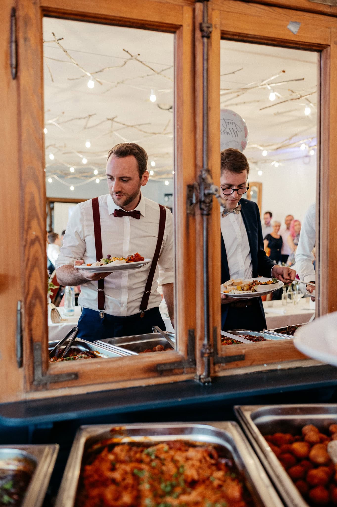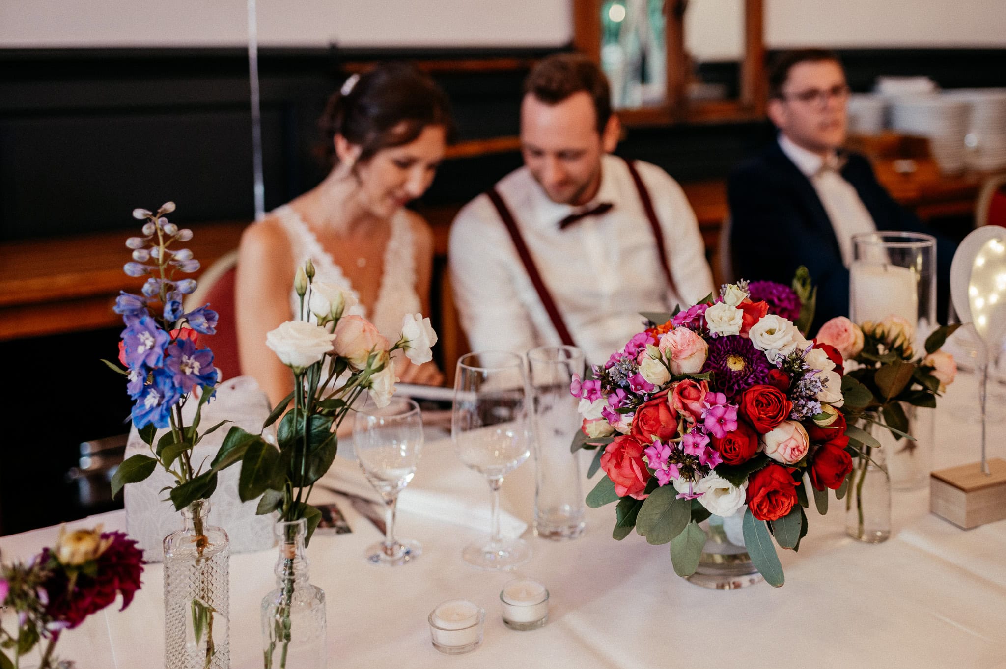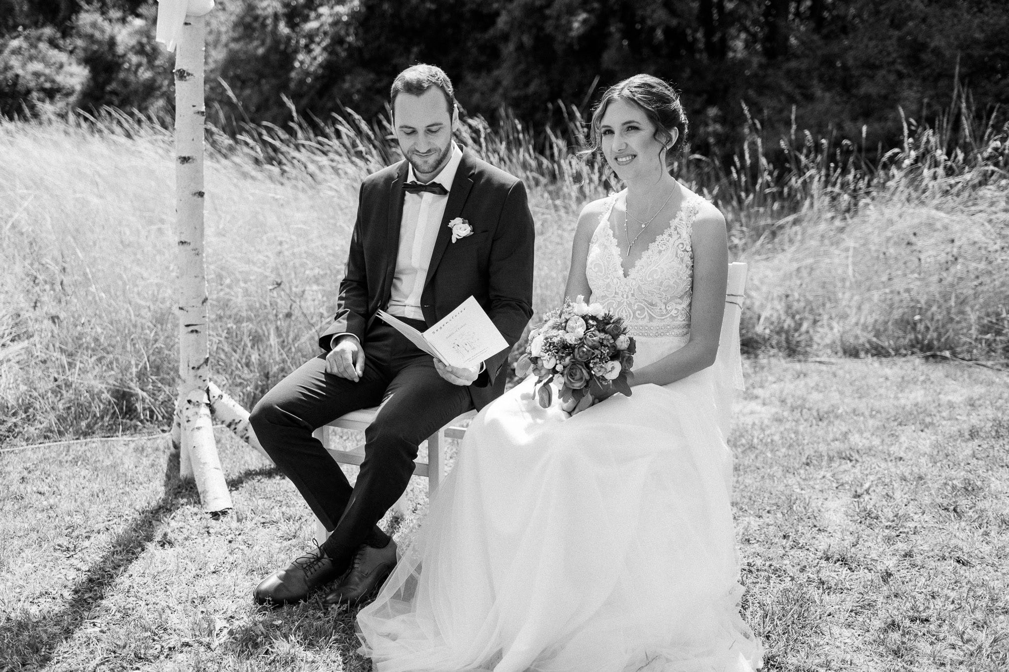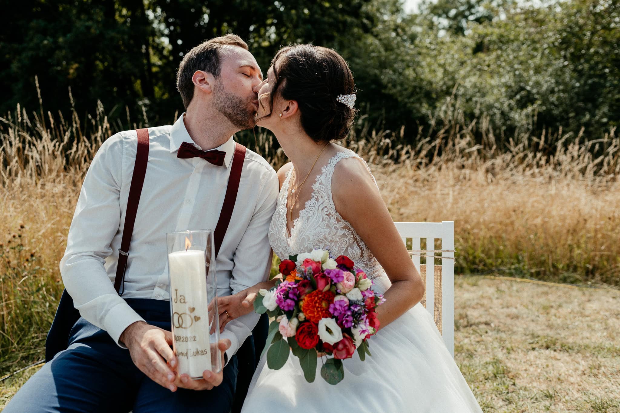 Die Trauung wurde musikalisch von Freunden und der Gitarre wunderschön untermalt und durch kleine, feine Rituale zu etwas ganz Besonderem. Einziges kleines Manko, das Wetter. Das war einfach ZU schön. Das Brautpaar „flüchtete“ sich deswegen während der Trauung unter einen süßen Snoopy-Schirm und die Gäste hatten teilweise richtig lustige Hüte und Mützen auf.