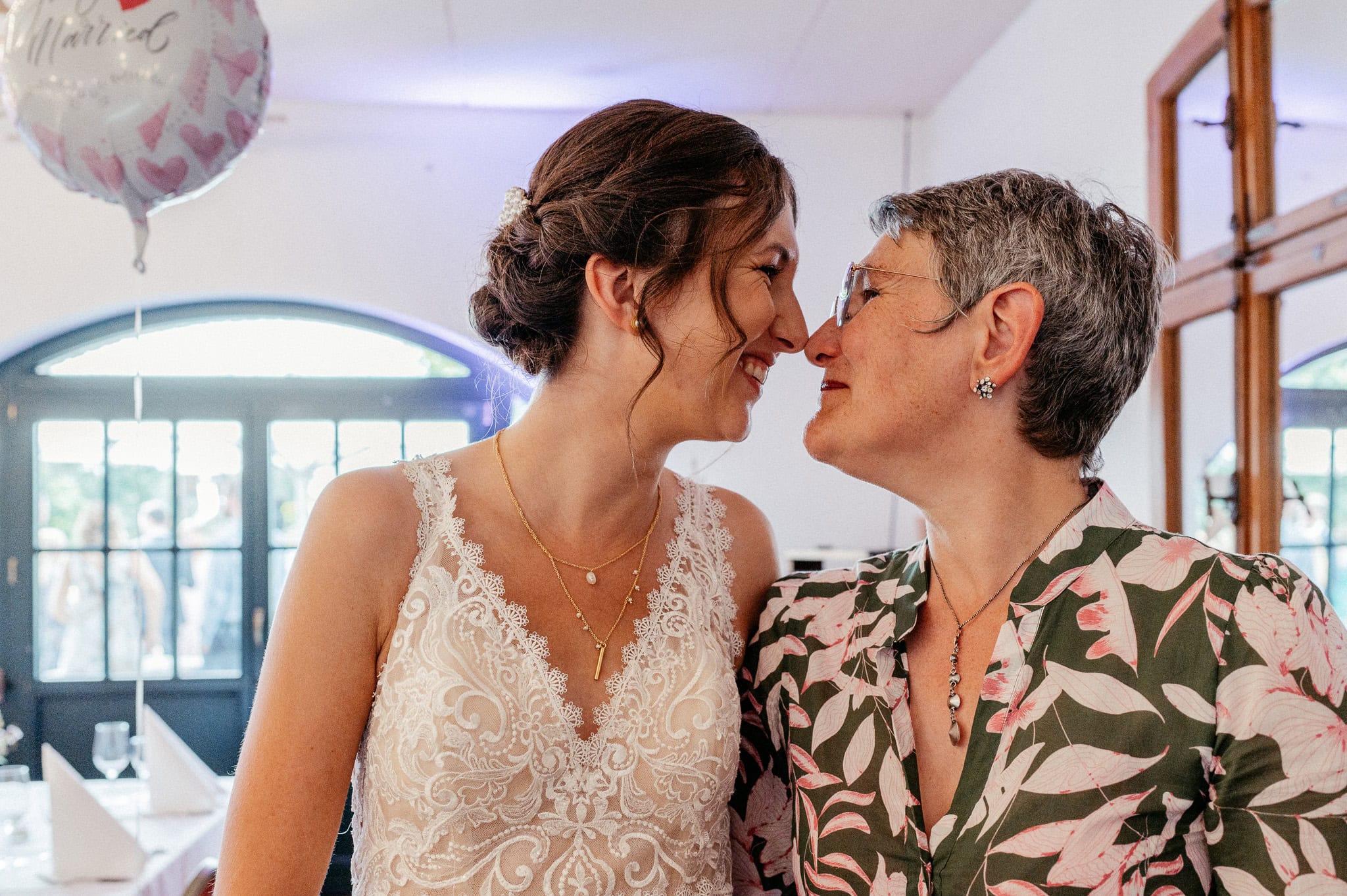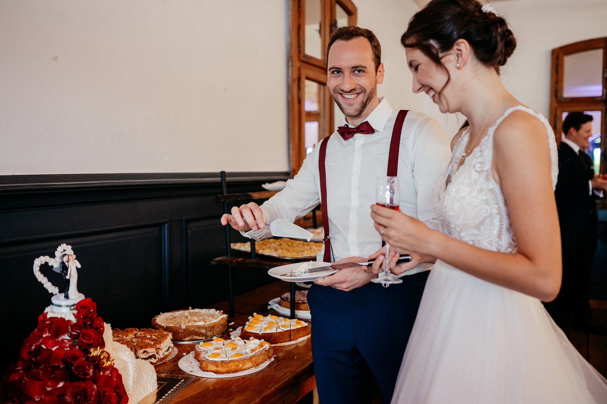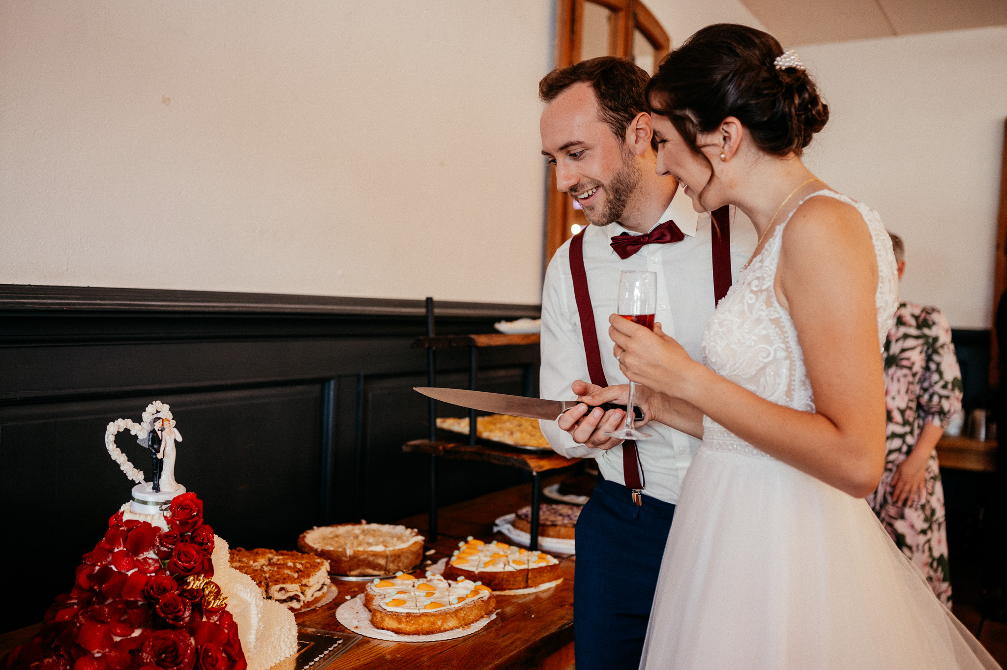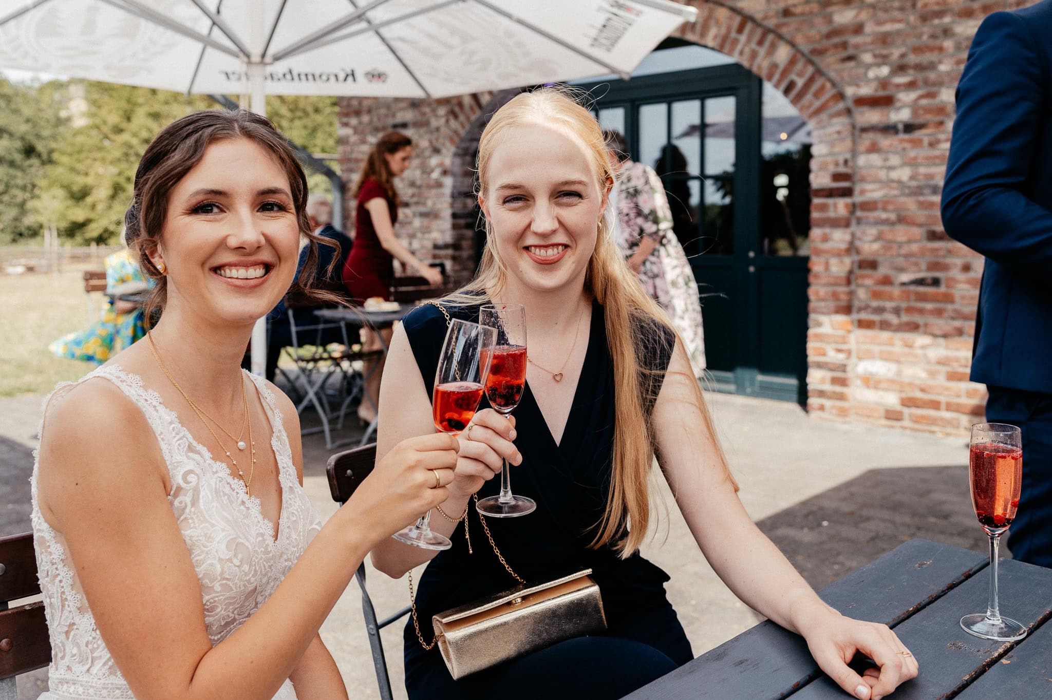 Im Anschluss an die Trauung wurden Gratulationen entgegengenommen und bei einem kühlen Getränk die Torte angeschnitten. Die Location, der Averdunkshof bot zum Glück ausreichend Schattenplätze, sowohl zum Entspannen, Torte essen und für die Gruppenfotos. In der Mittags- und Nachmittags-Zeit schauen wir, dass wir nicht in der prallen Sonne fotografieren. Denn diese wirft nicht nur unschöne Schatten, sondern führt auch dazu, dass das Brautpaar und die Gäste ins Schwitzen kommen.