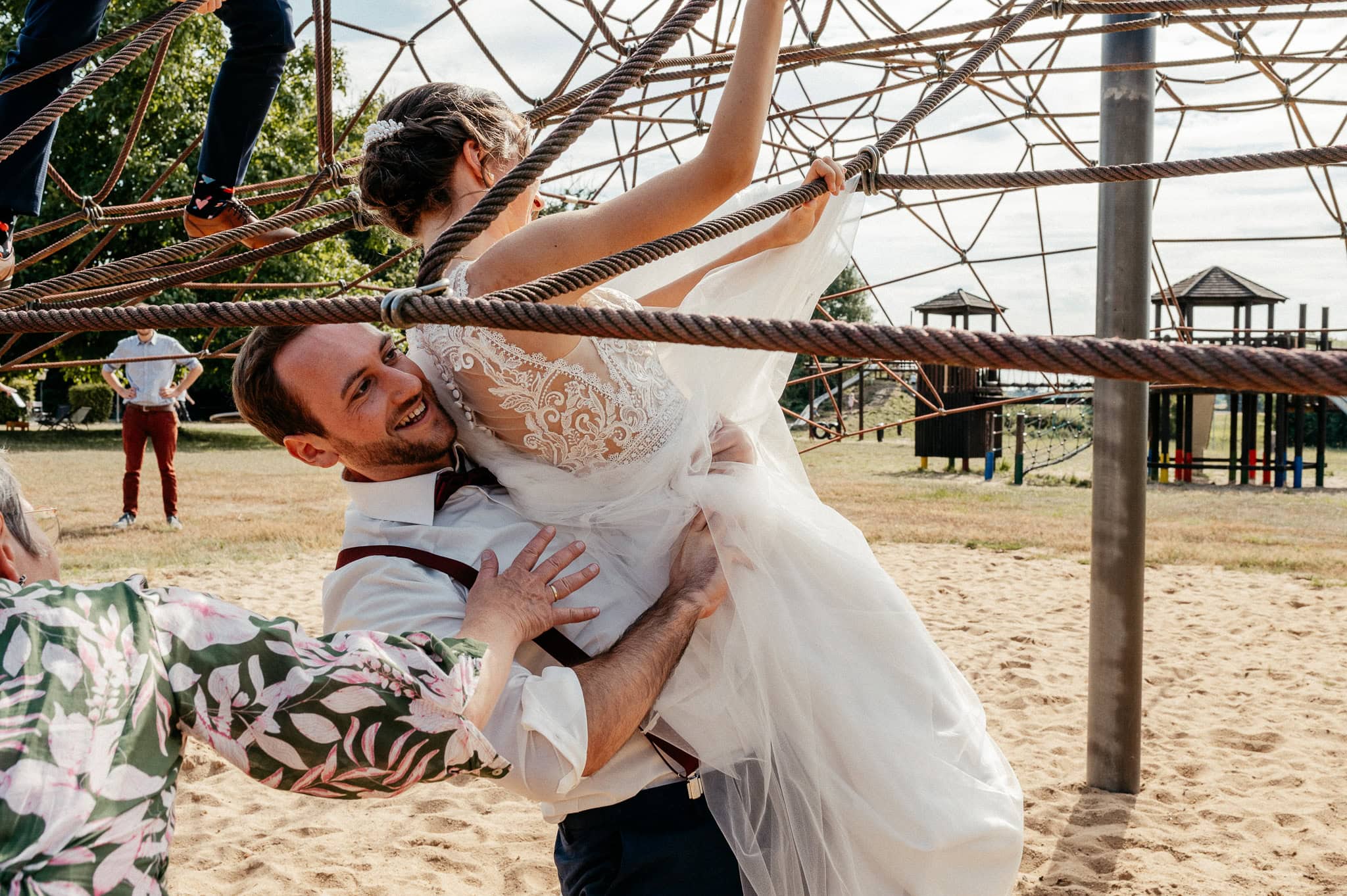 Das Foto auf der Seilbahn war unser absoluter Höhepunkt, auch wenn Judiths Brautkleid minimal leiden musste. Nachdem wir noch einen Fotostop auf der Hochzeitswiese eingelegt hatten und der Brautstraße geworfen wurde, ging die Party los. Mit dabei unser Photobooth Mr. Hudson, der fleißig zum Einsatz kam.