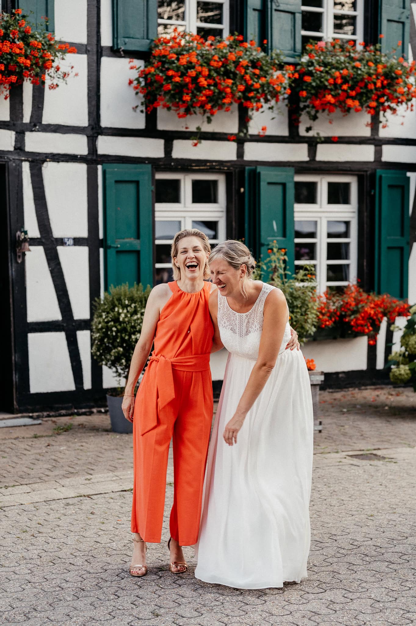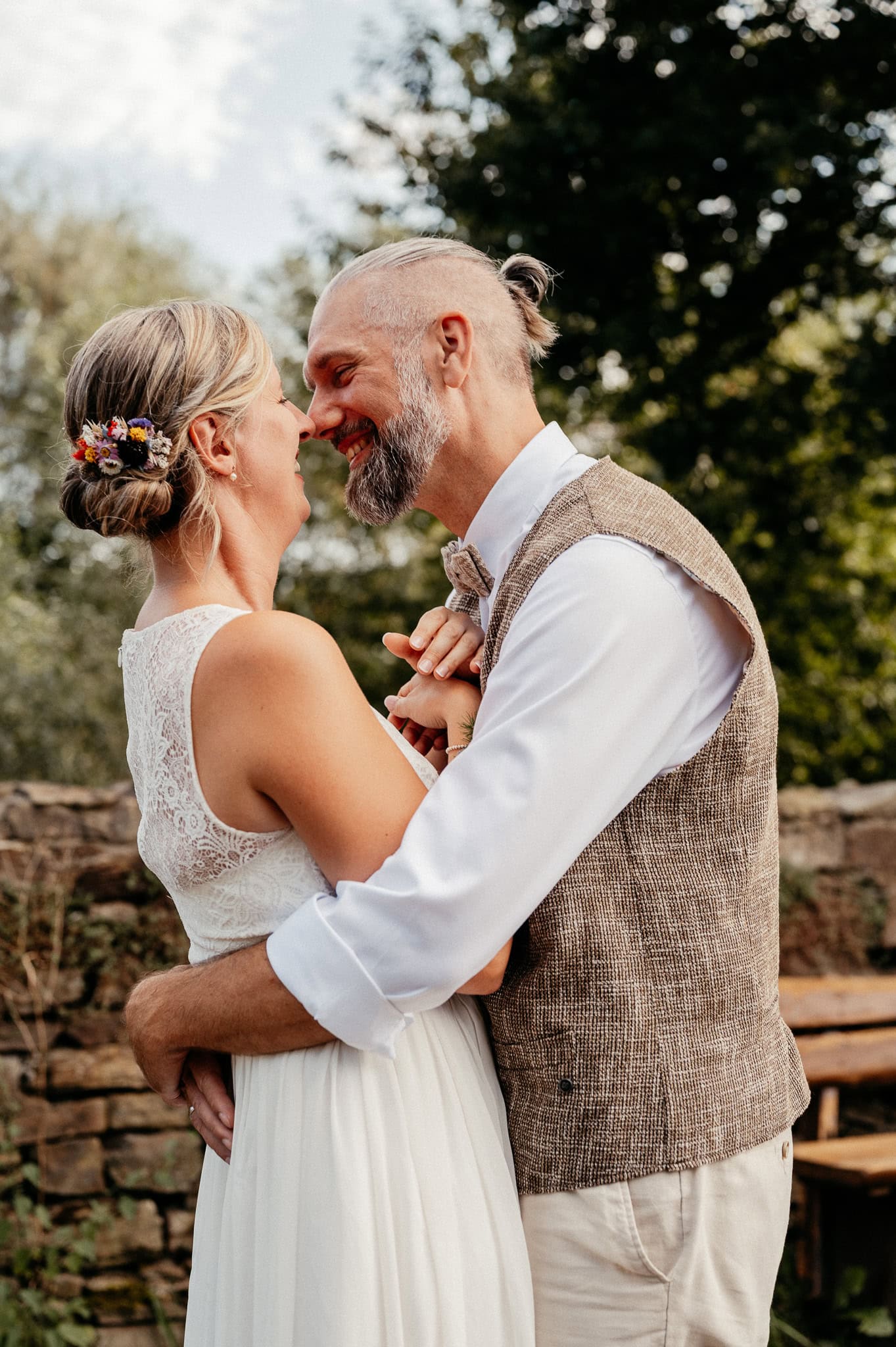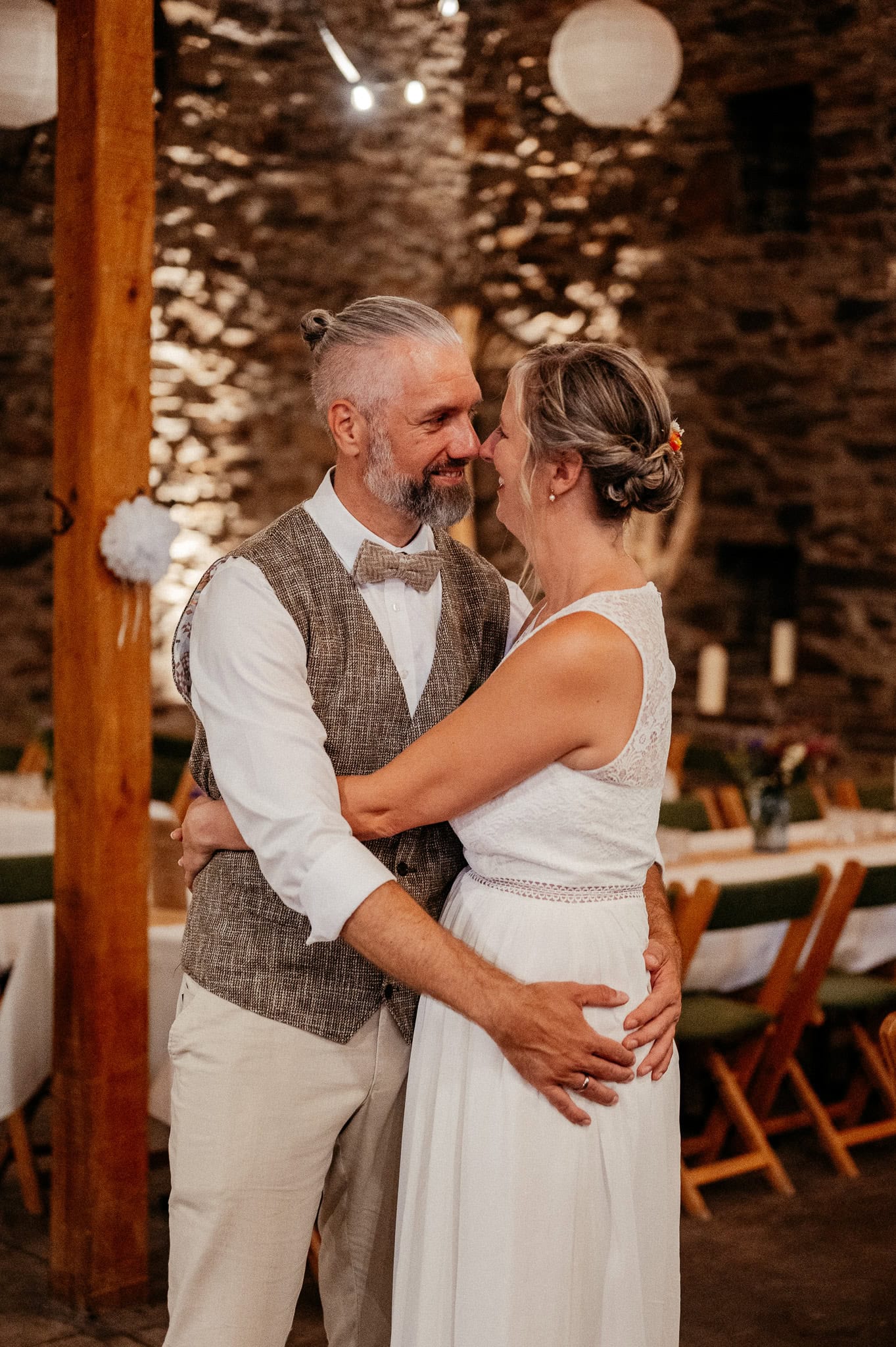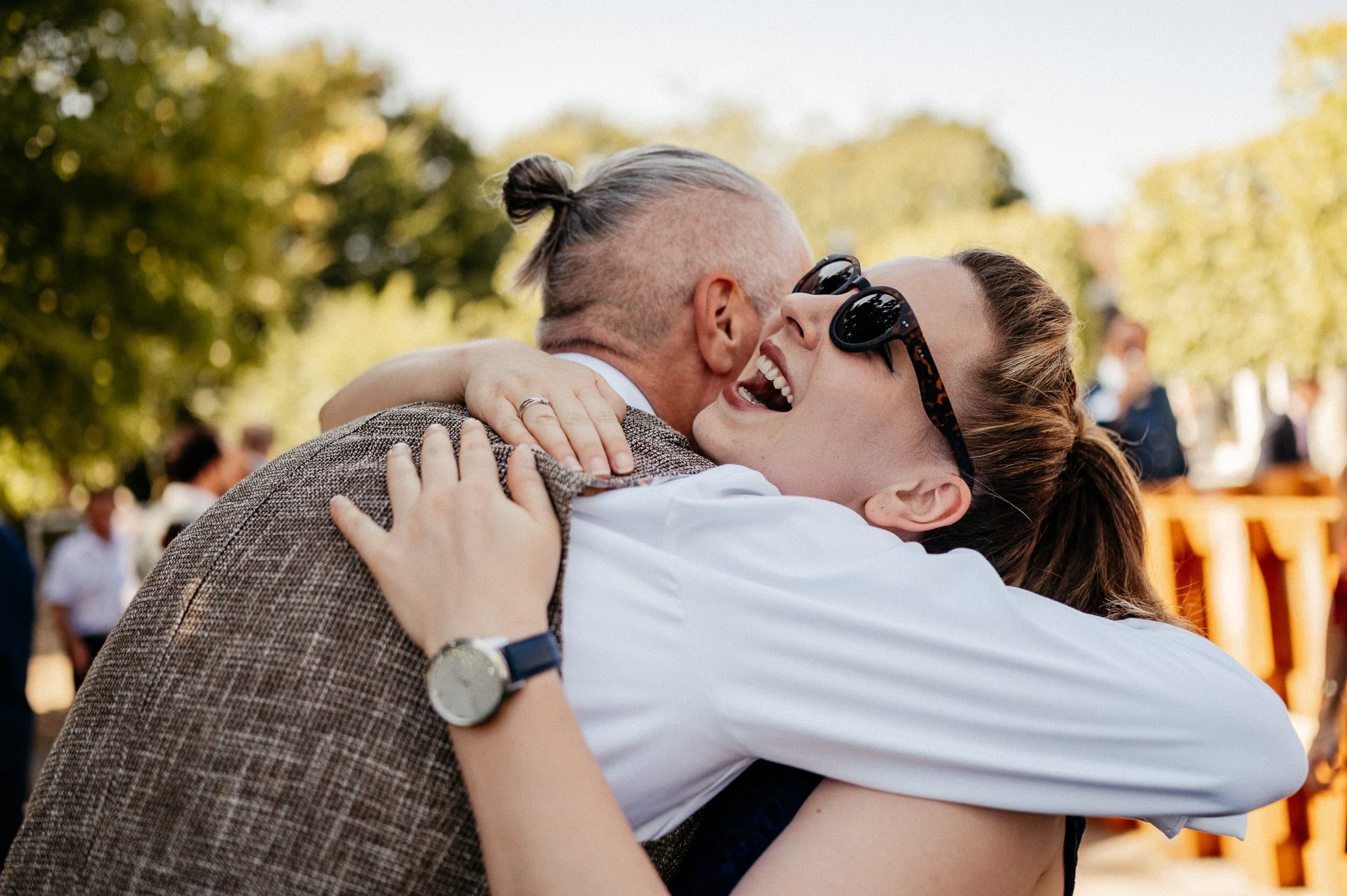 Rustikale Locations bringen oft automatisch Ruhe in den Tag. Gäste verteilen sich entspannt, es entstehen kleine Gespräche am Rand, ein kurzes Lachen zwischendurch, eine Umarmung, die niemand „plant“. Für Euch als Brautpaar heißt das: Ihr erlebt Euren Tag bewusster. Für uns als Fotografinnen entstehen Bilder, die genau diese Nähe und Leichtigkeit zeigen.