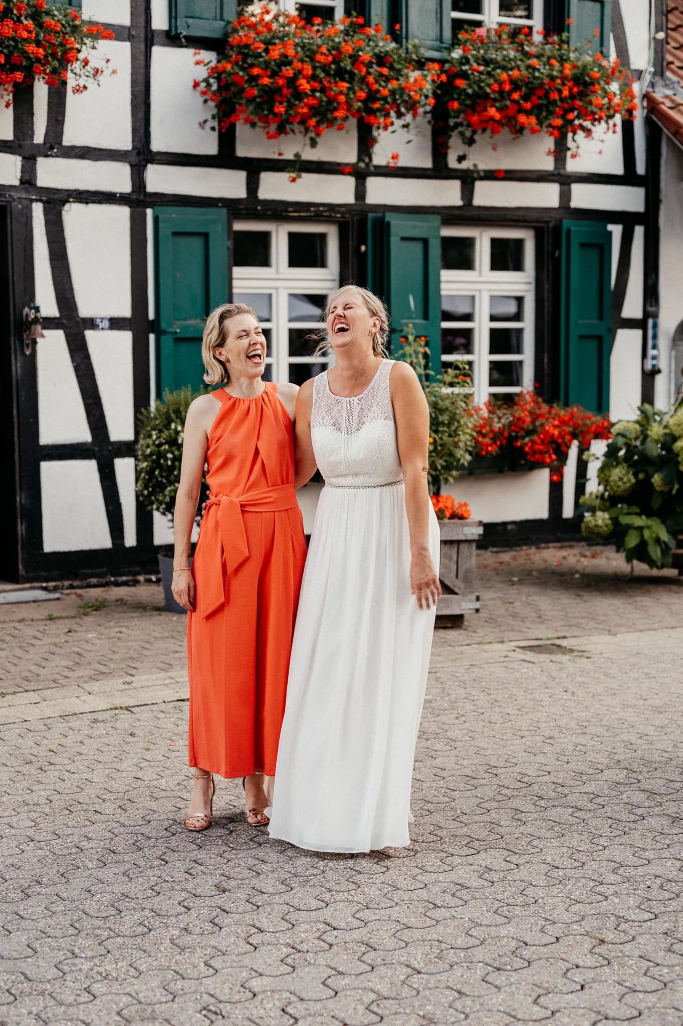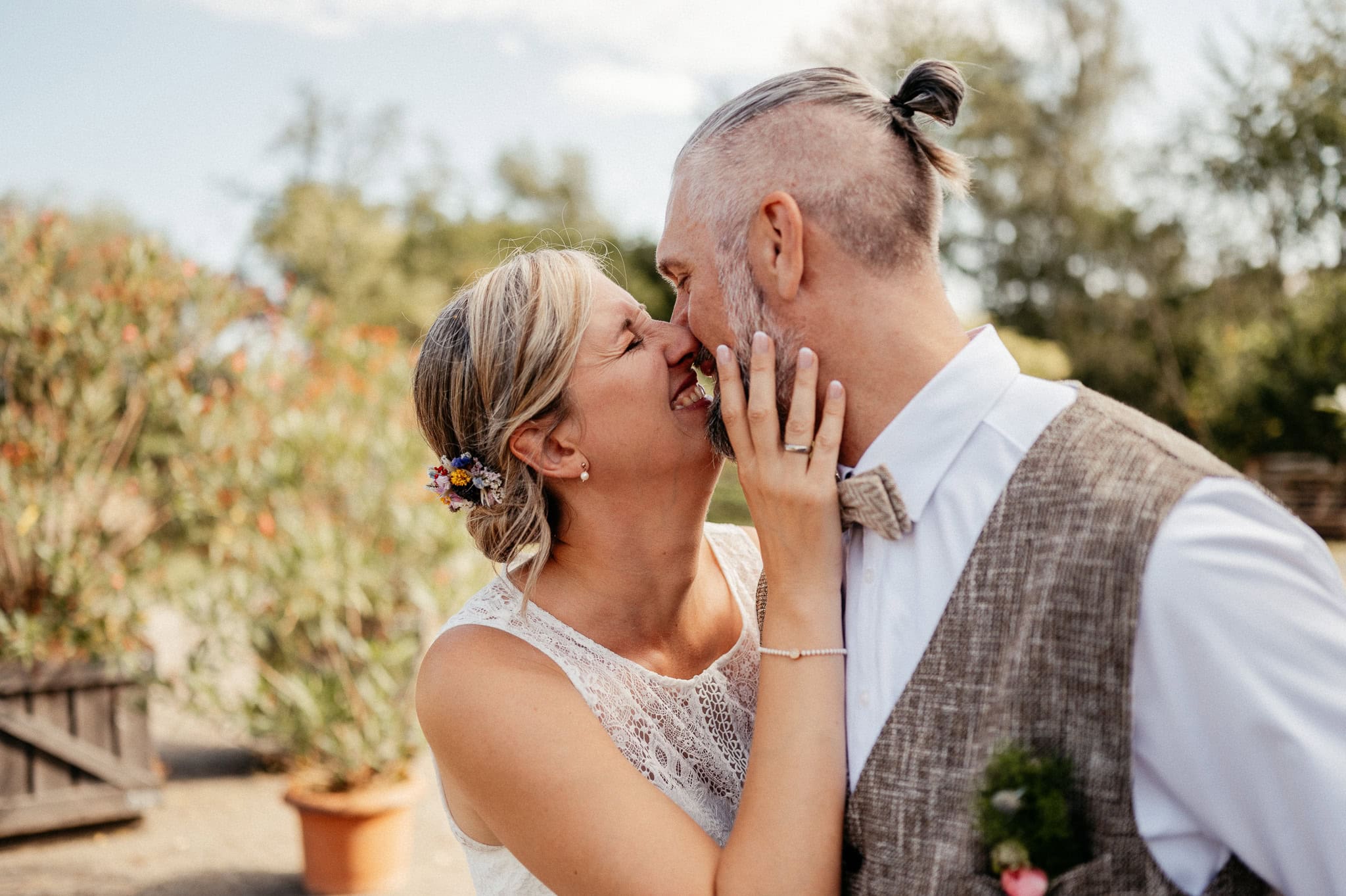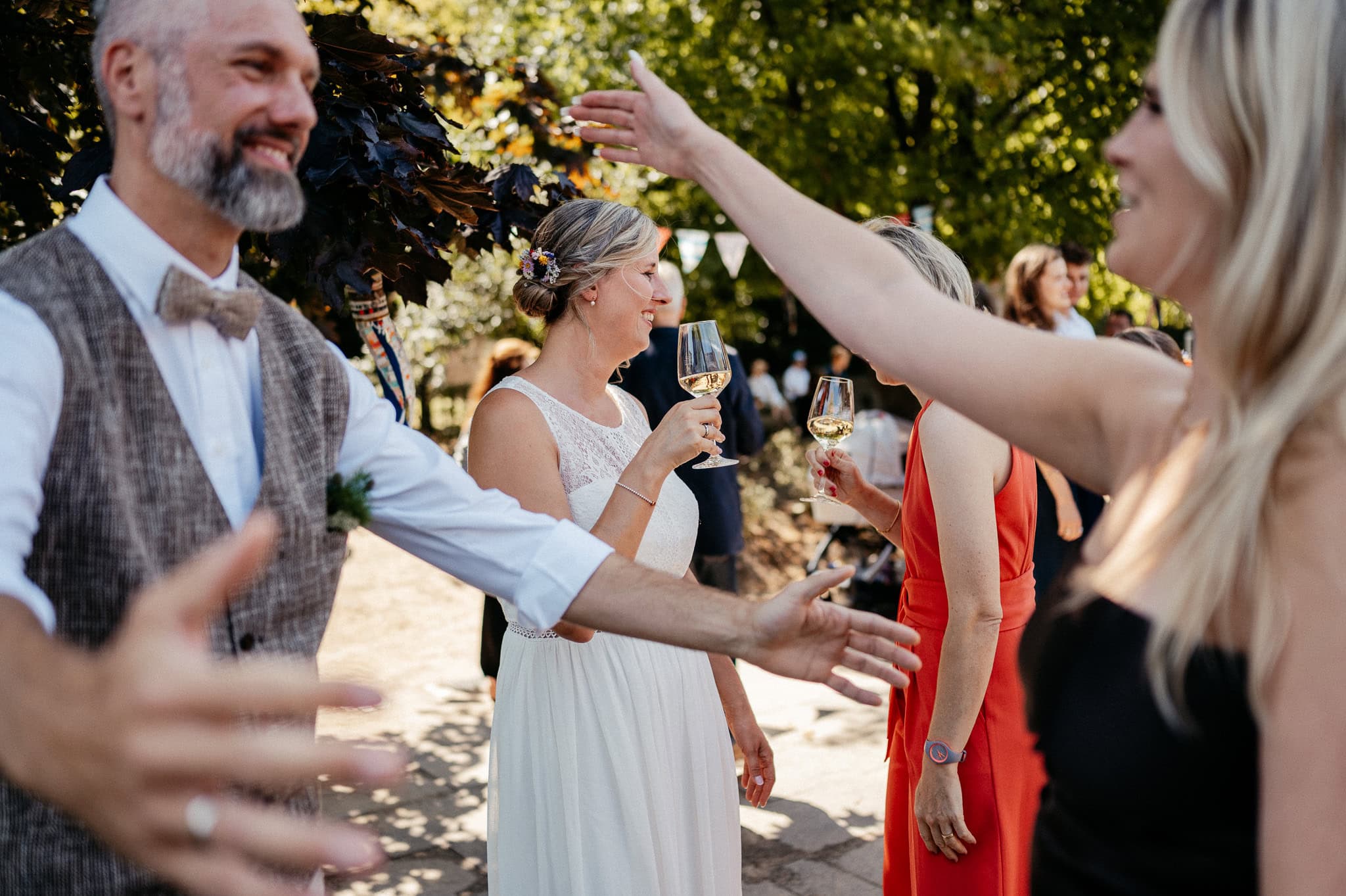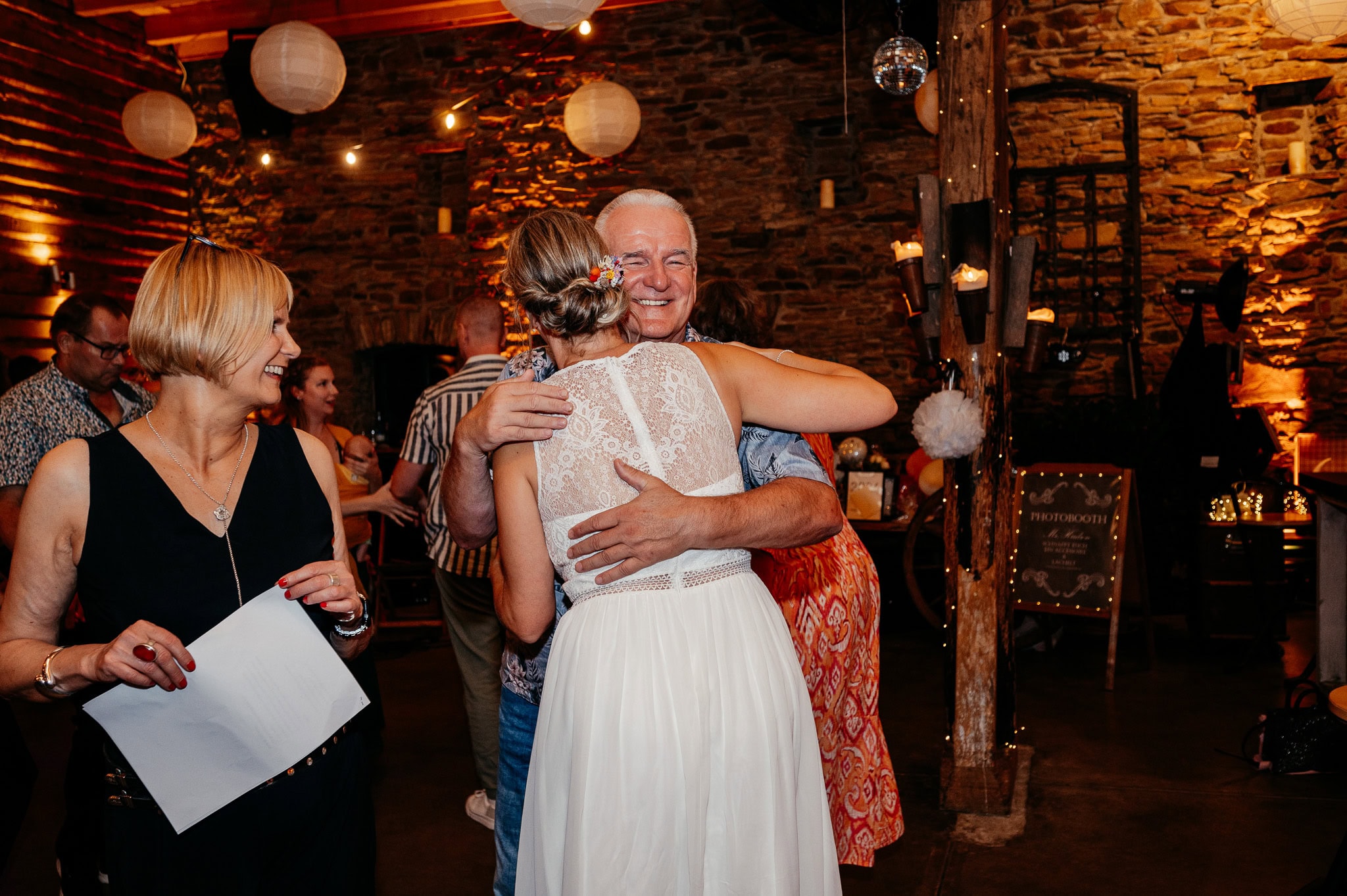 Rustikale Locations bringen oft automatisch Ruhe in den Tag. Gäste verteilen sich entspannt, es entstehen kleine Gespräche am Rand, ein kurzes Lachen zwischendurch, eine Umarmung, die niemand „plant“. Für Euch als Brautpaar heißt das: Ihr erlebt Euren Tag bewusster. Für uns als Fotografinnen entstehen Bilder, die genau diese Nähe und Leichtigkeit zeigen.