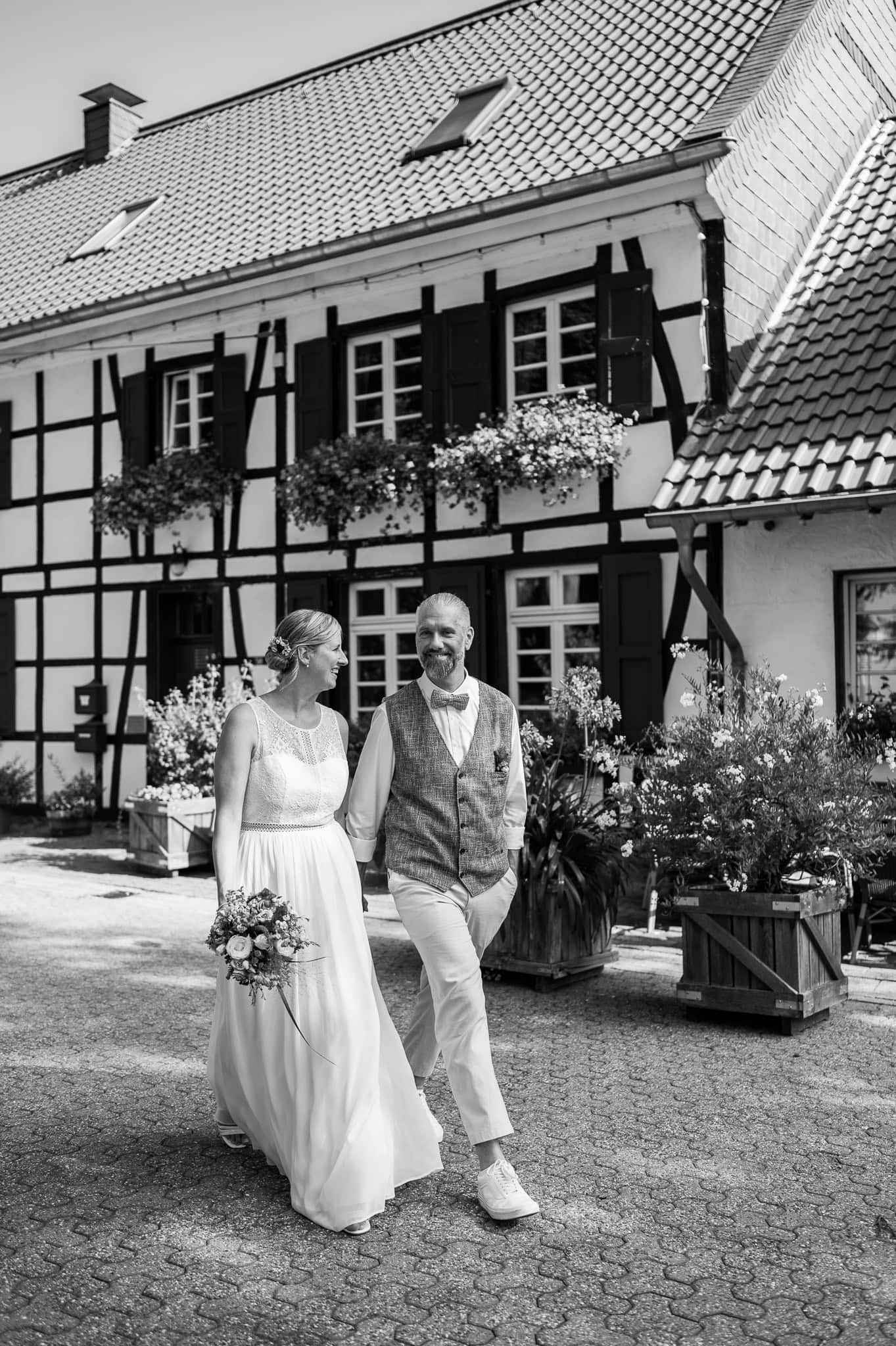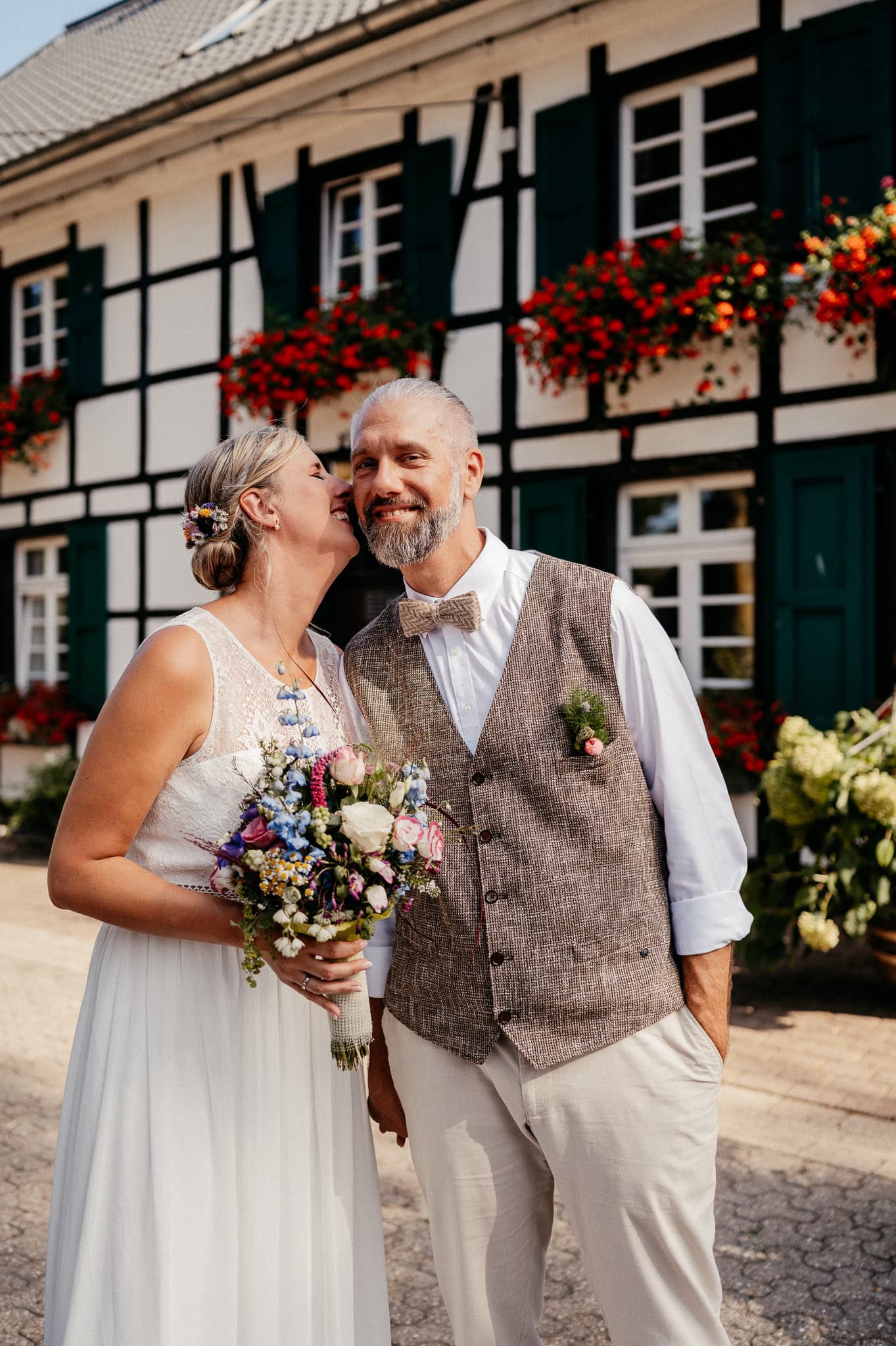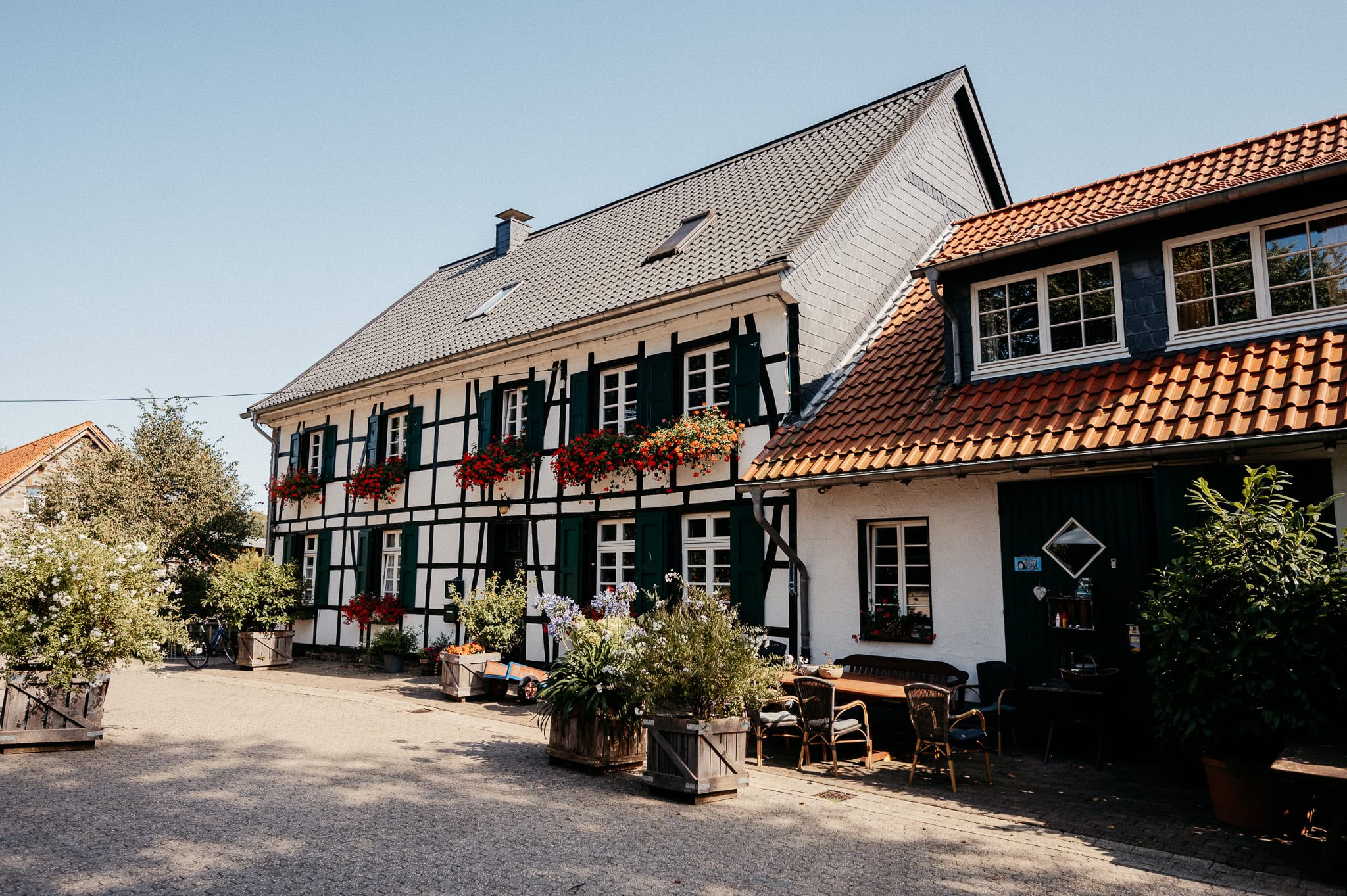 In den meisten Fällen lohnt es sich, Paarfotos und Gruppenbilder direkt vor Ort zu machen. Ein schöner Hof bietet oft viele unterschiedliche Fotospots: mal rustikal, mal weit und offen, mal ruhig im Hintergrund. Und das Beste: Es passt sich Eurem Tagesablauf an. Kein Stress, keine langen Wege, kein ständiges „Wir müssen jetzt los“.