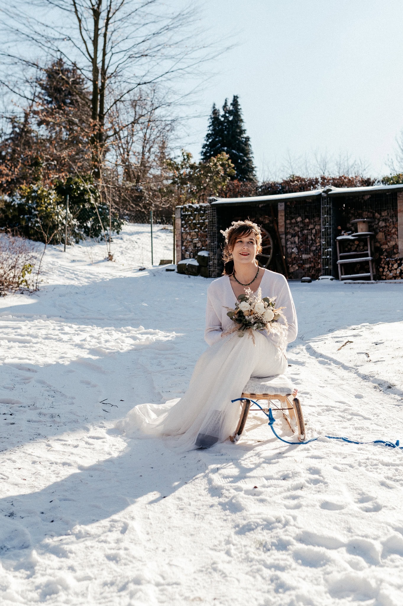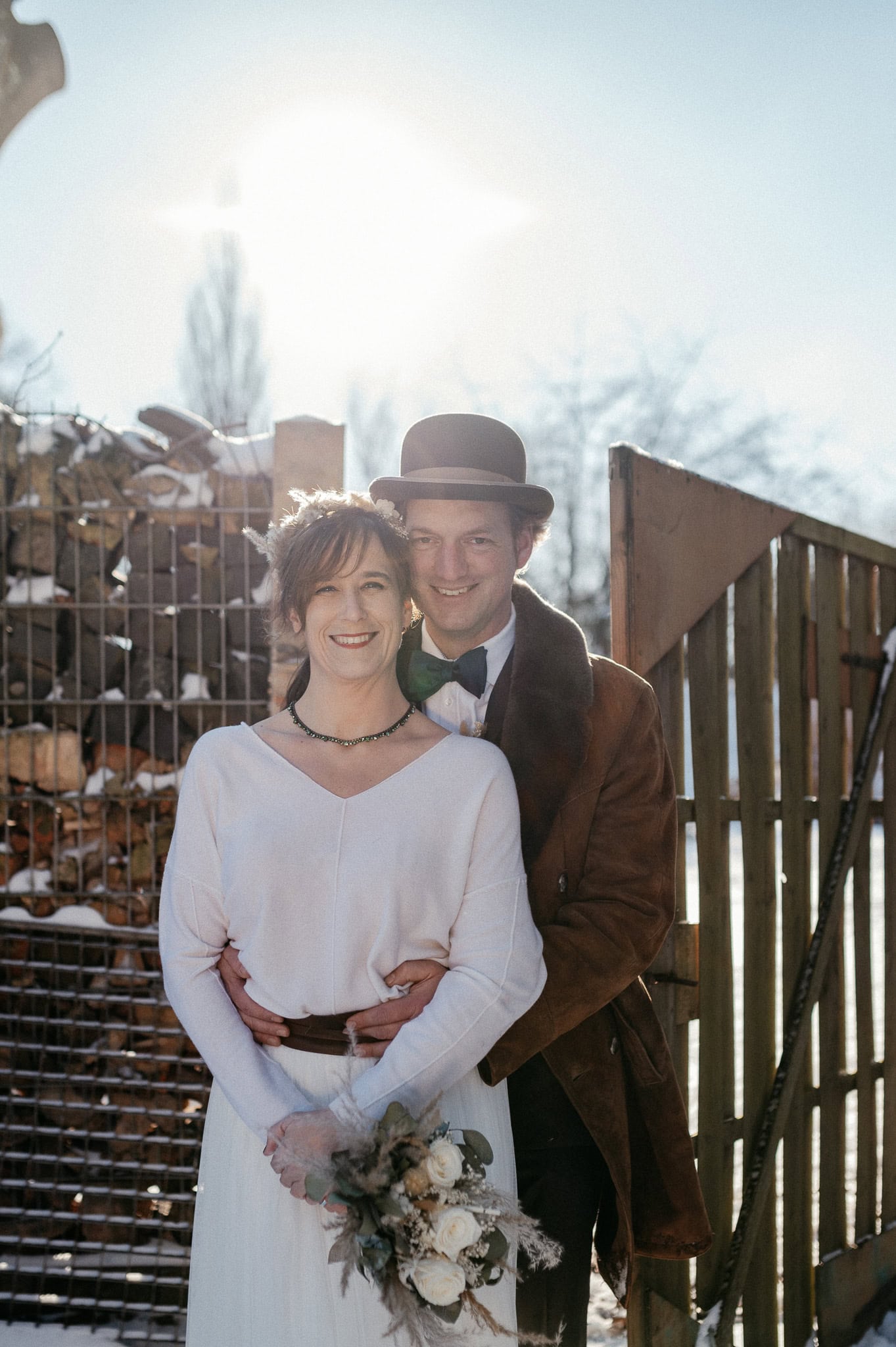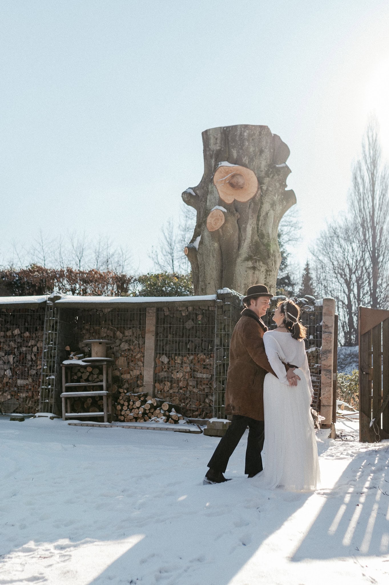 Eine Hochzeit im Schnee ist immer etwas ganz Besonderes. Genau deshalb haben wir diese Kulisse als Hochzeitsfotografen voll ausgekostet. Die Hochzeitsfotos sind am Elternhaus von Kai entstanden – einem alten Bauernhof mit ganz viel Charme und Geschichte.