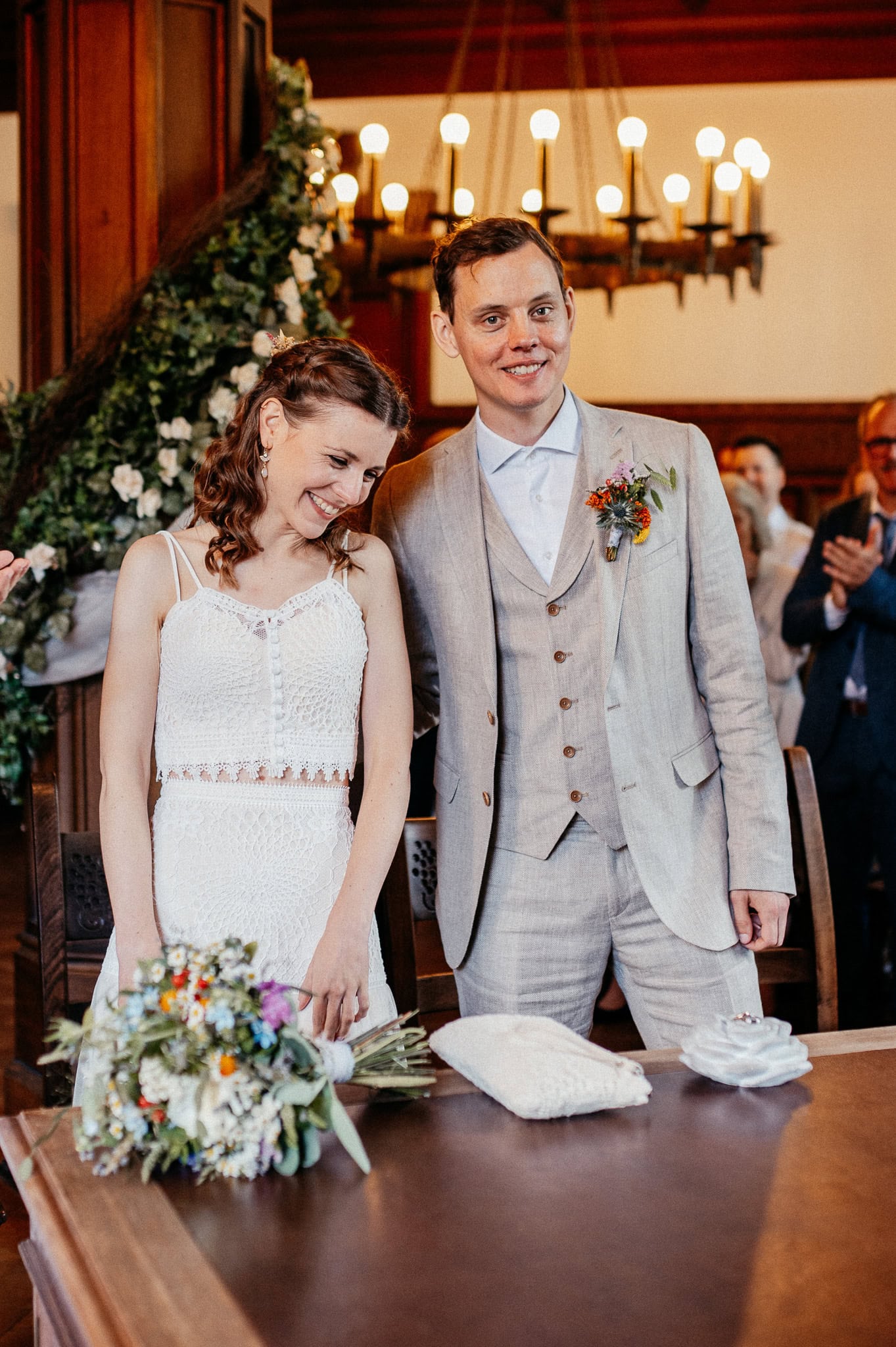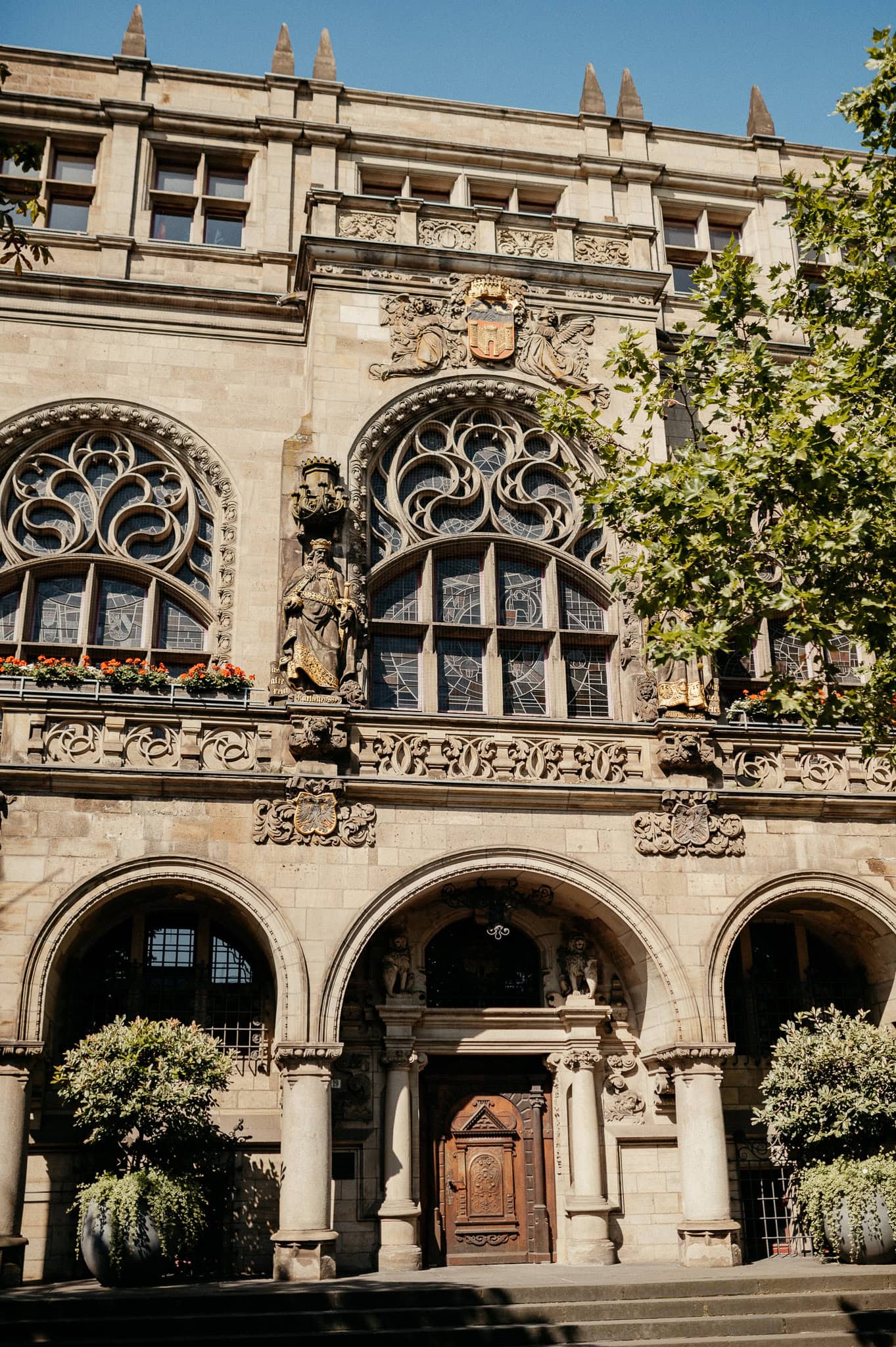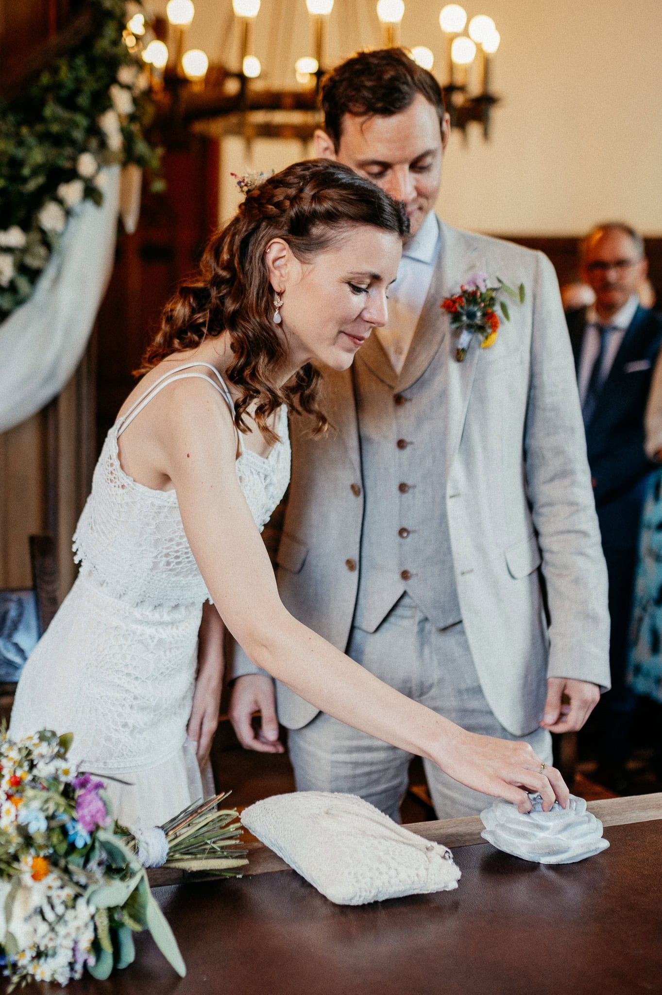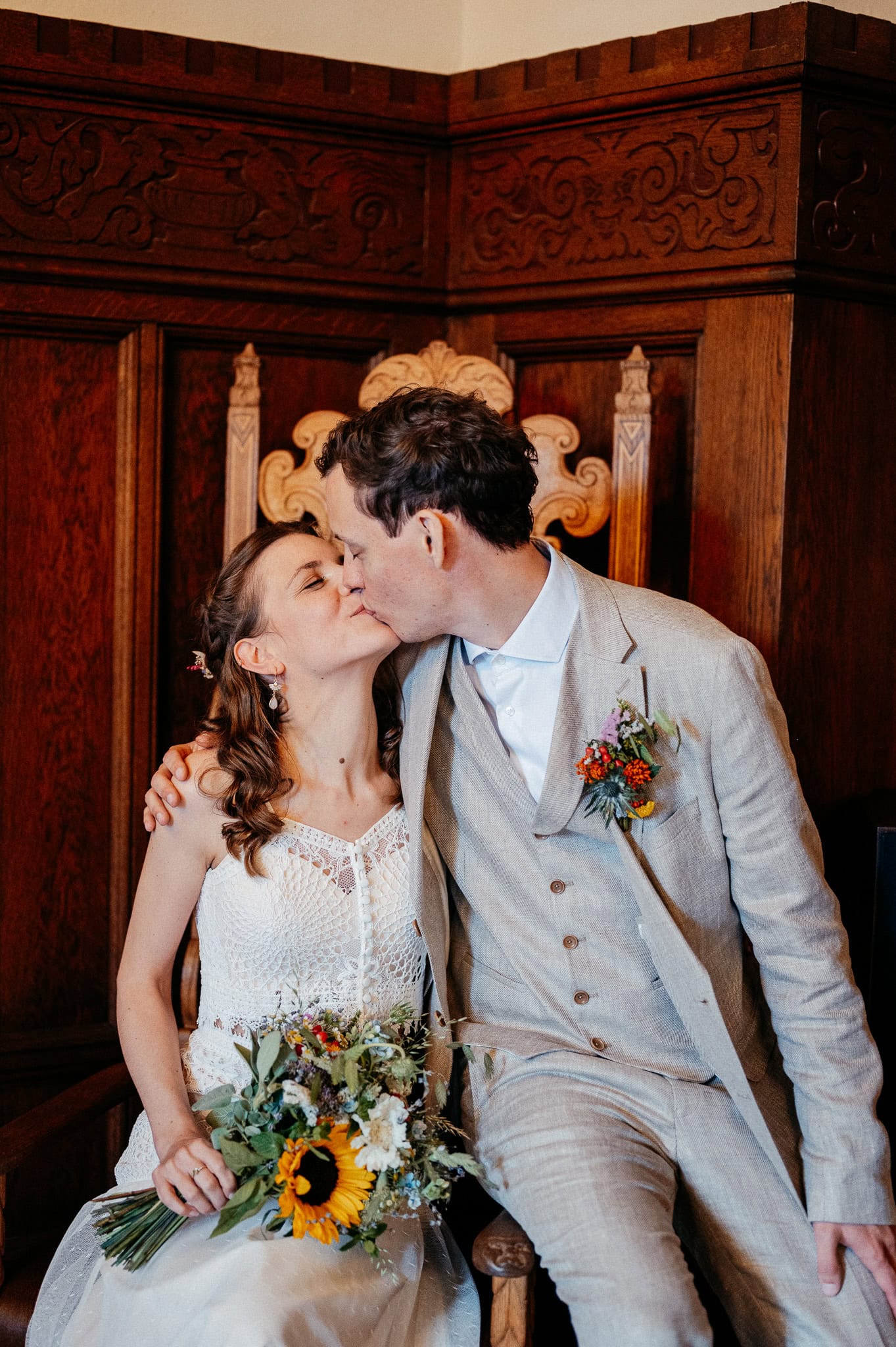 Eine Boho-Hochzeit mitten im Sommer in Duisburg? Klingt erst mal merkwürdig, denn wenn man an Duisburg denkt, tauchen oft Bilder von Industrieanlagen und rauem Ruhrpott-Charme auf. Doch das Standesamt in Duisburg-Mitte, direkt am Burgplatz, ist ein echtes Juwel: Es befindet sich im historischen Rathaus, das in Frührenaissance-Bauweise auf mittelalterlichen Fundamenten errichtet wurde, und begeistert mit liebevoll erhaltenen Details. Besonders das Trauzimmer beeindruckt – nicht durch moderne Helligkeit, sondern mit kunstvollen Vertäfelungen und verschnörkelten Elementen, die eine feierlich-elegante Stimmung erzeugen. Ein Raum voller Geschichte, der jeder Trauung Gewicht und Bedeutung verleiht.