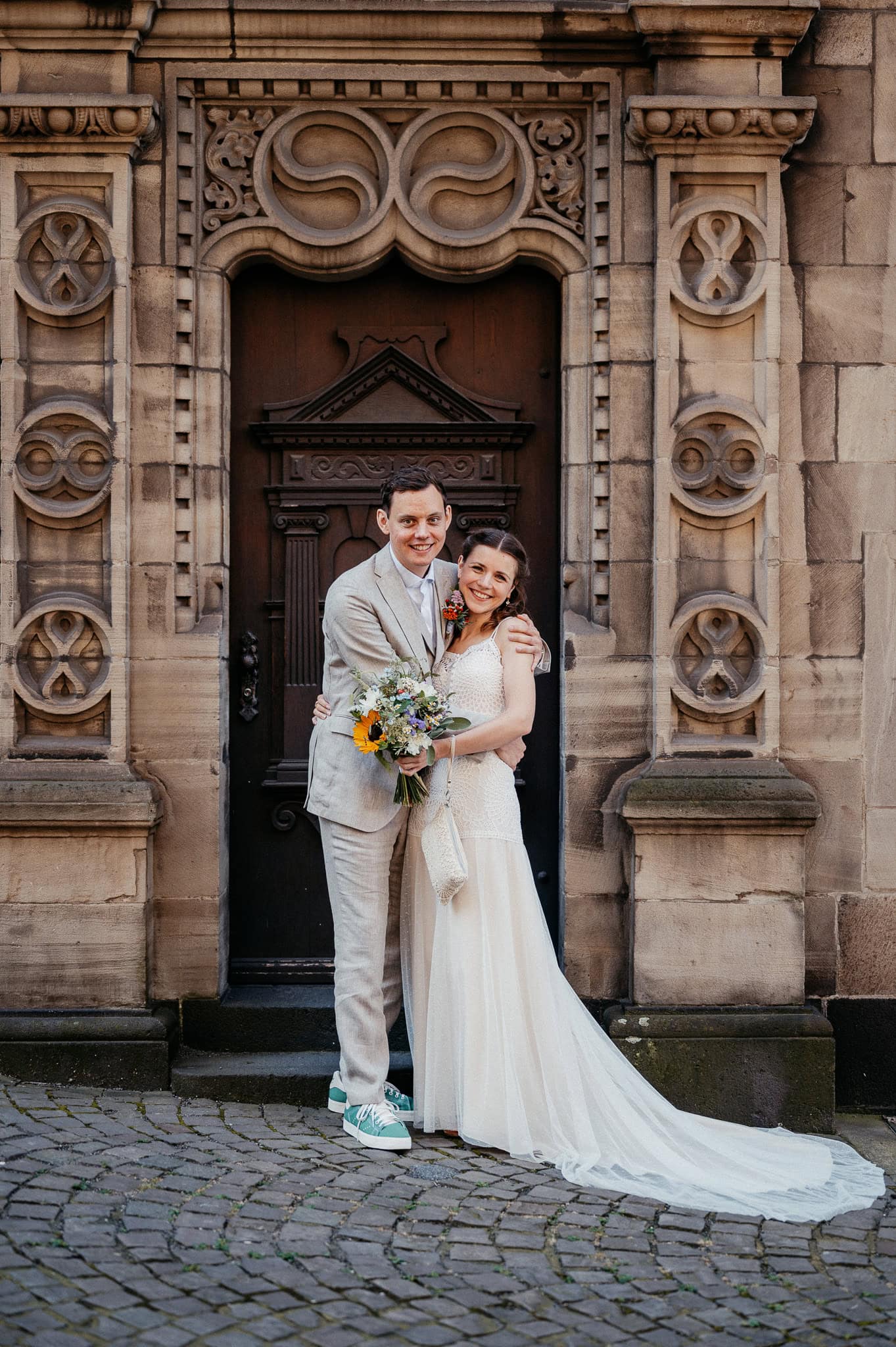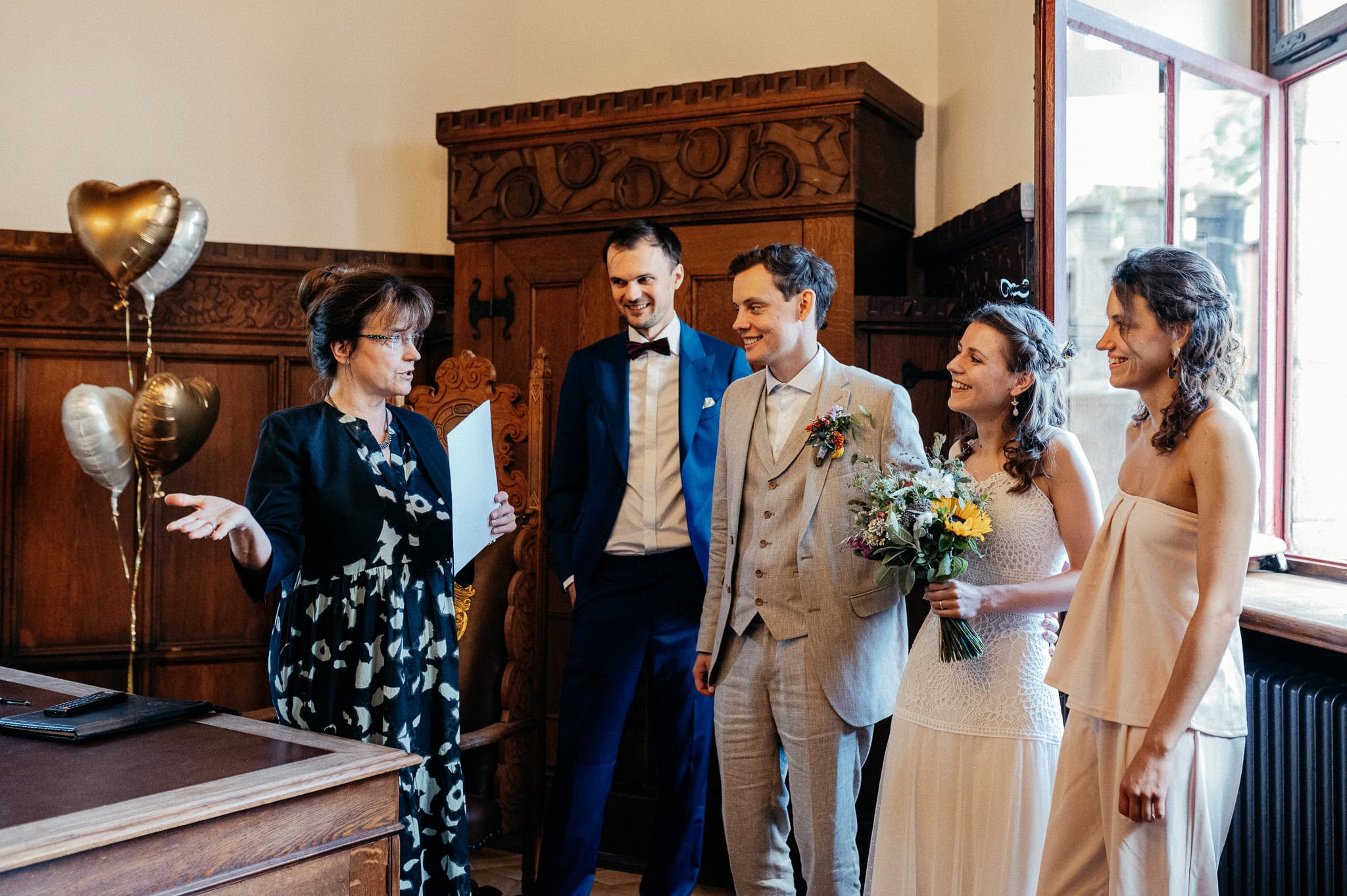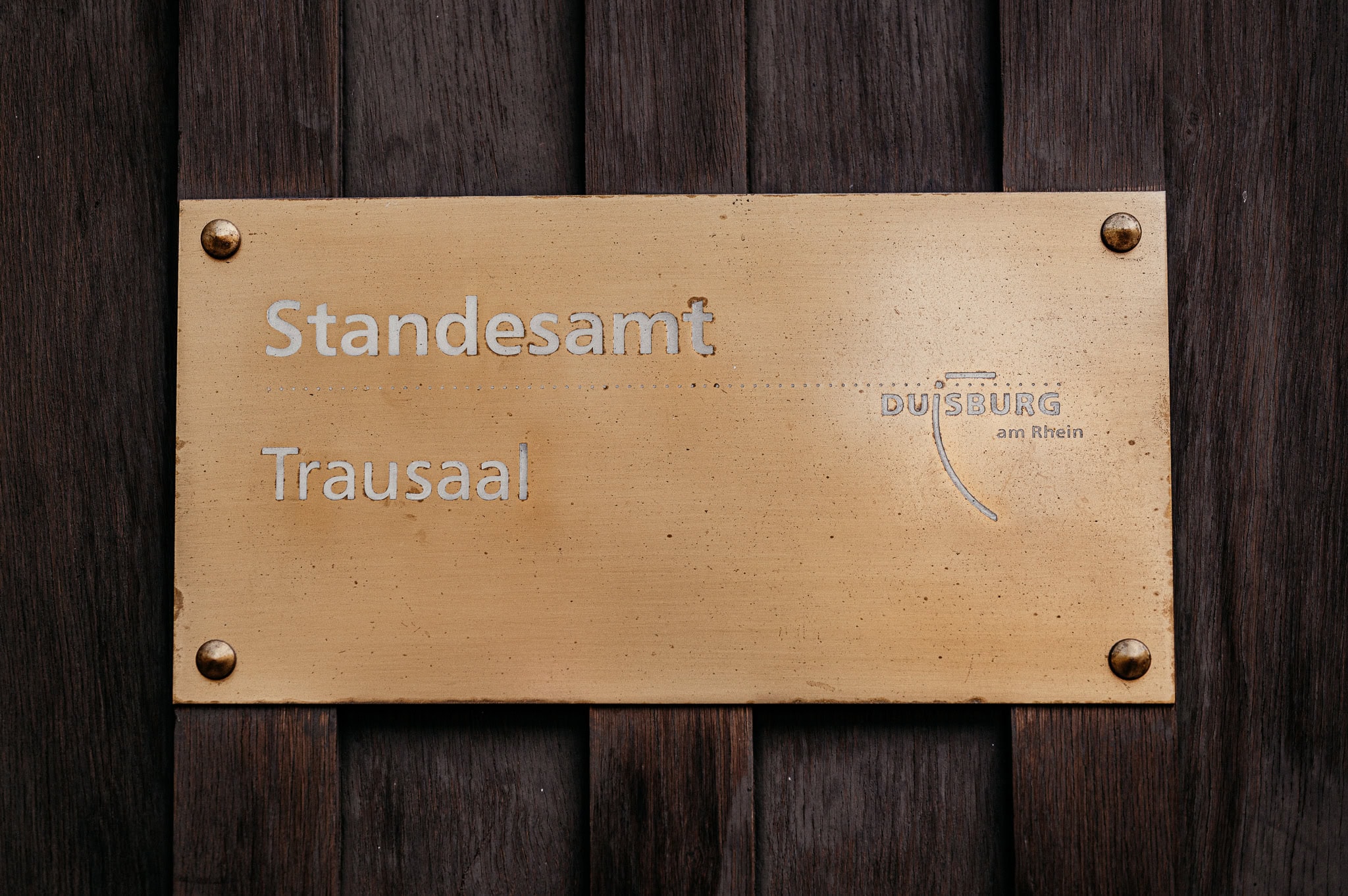 Für das Brautpaar war Duisburg-Mitte außerdem die perfekte Wahl, weil sie eine etwas größere Hochzeitsgesellschaft eingeladen hatten. Im Vergleich dazu fallen die Standesämter in Ratingen oder Düsseldorf deutlich kleiner aus und hätten diese Runde gar nicht aufnehmen können. So konnten sie ohne Kompromisse all ihre Herzensmenschen dabeihaben und gemeinsam diesen besonderen Moment feiern. Ich (Hannah) war wirklich überrascht, dass Duisburg so ein atmosphärisches Standesamt zu bieten hat – viel stilvoller, als man es erwartet. Eine absolute Empfehlung für alle, die sich ausschließlich standesamtlich trauen lassen und auf keine Gäste verzichten möchten.