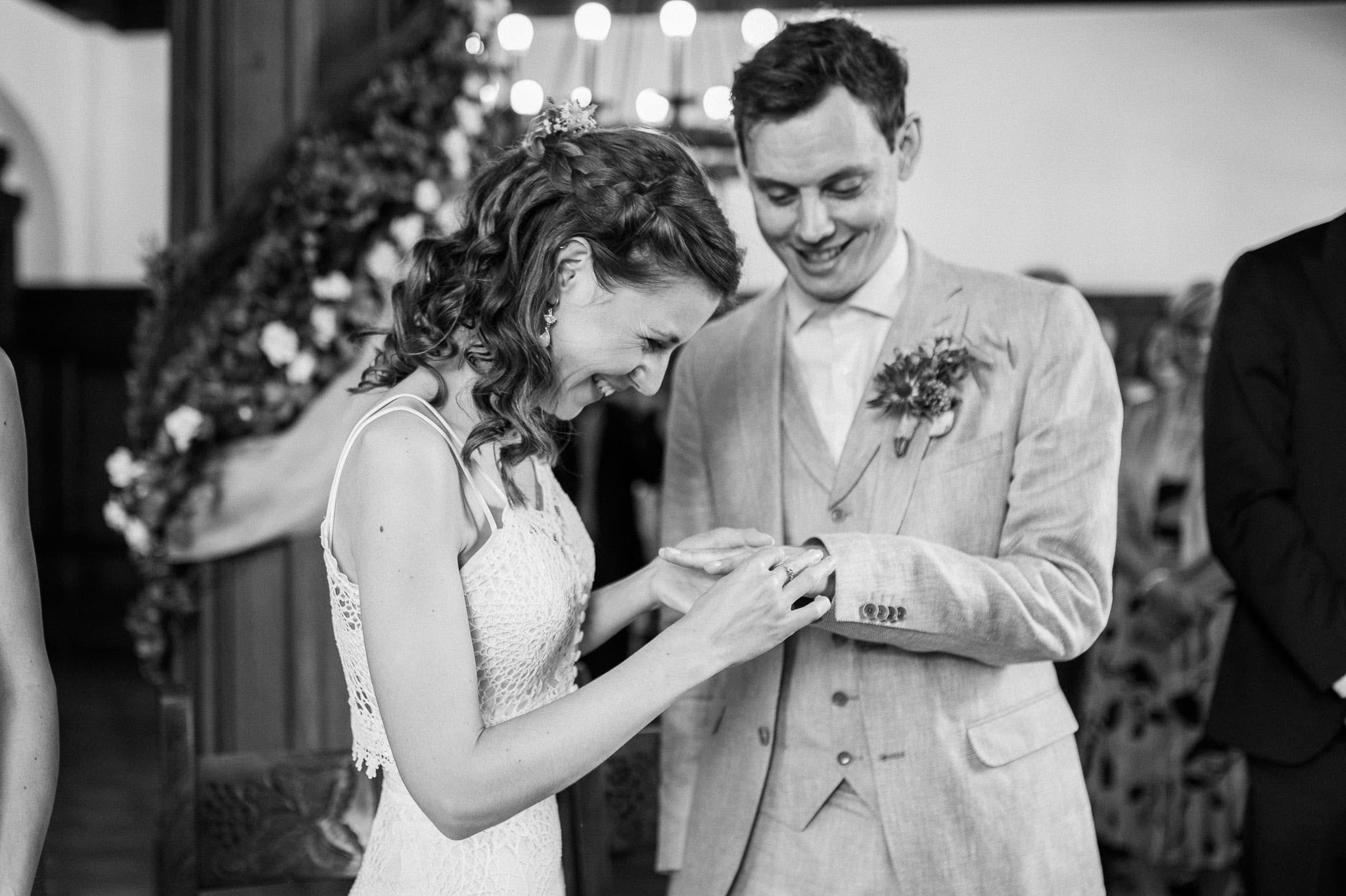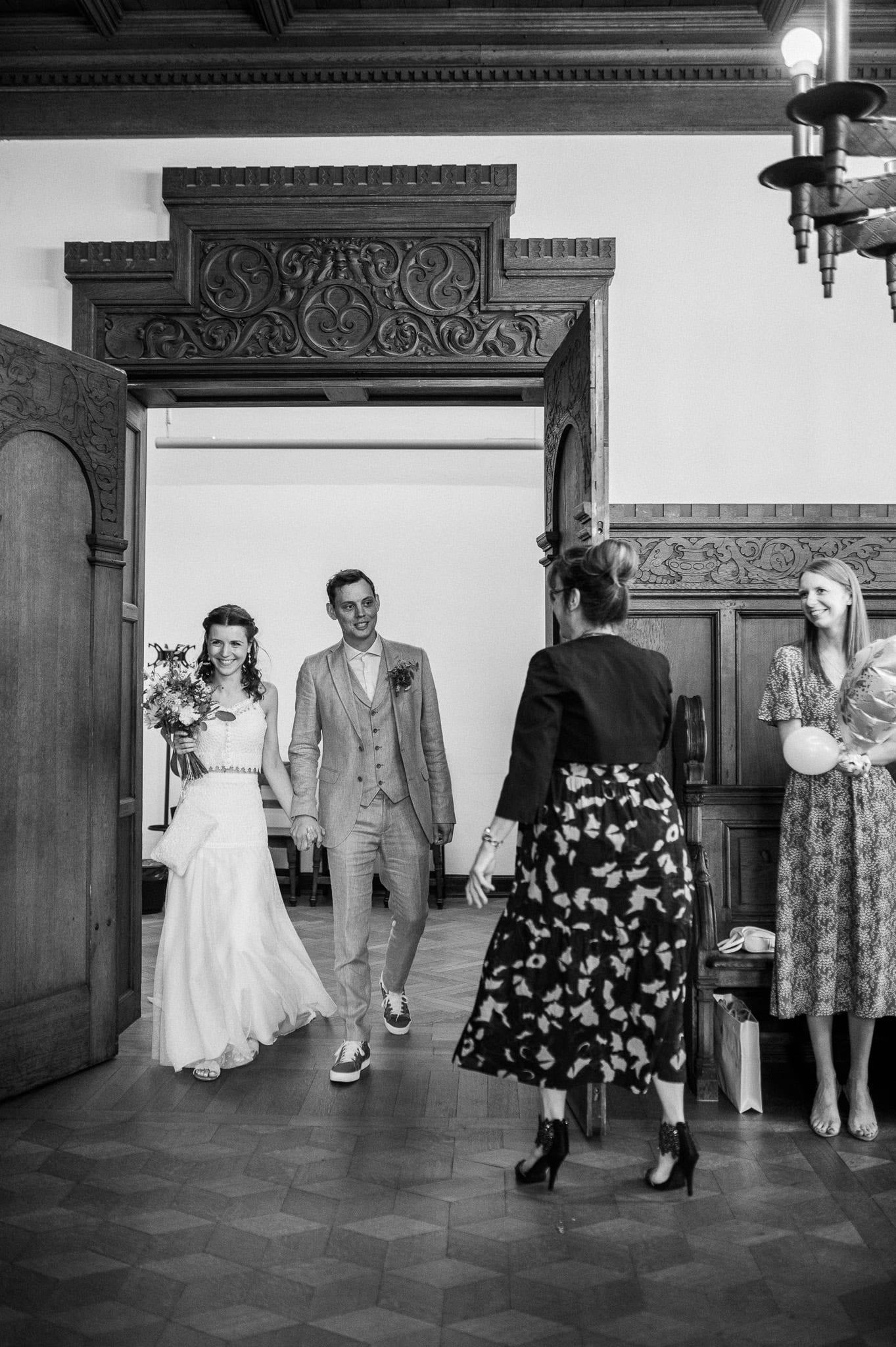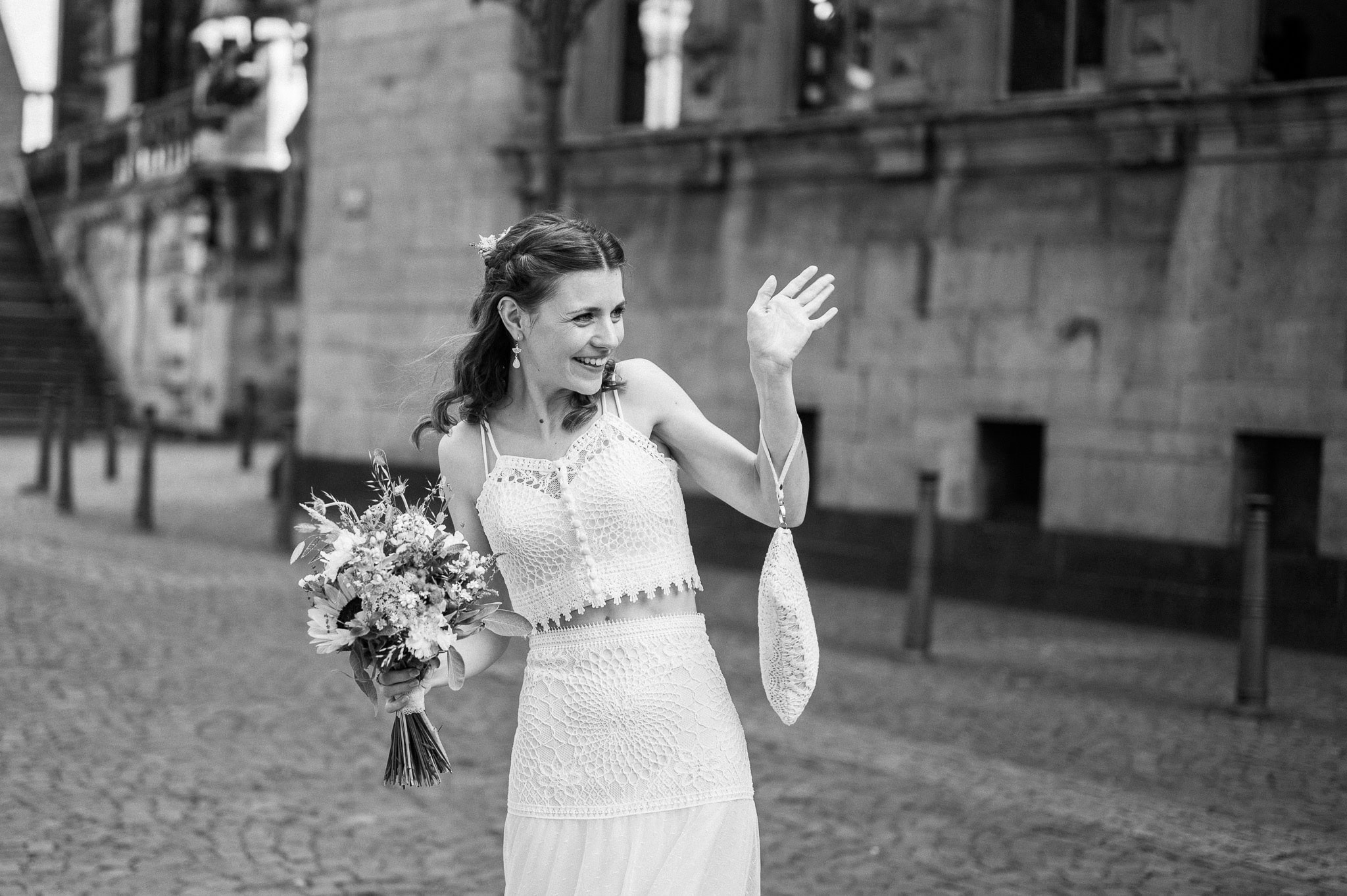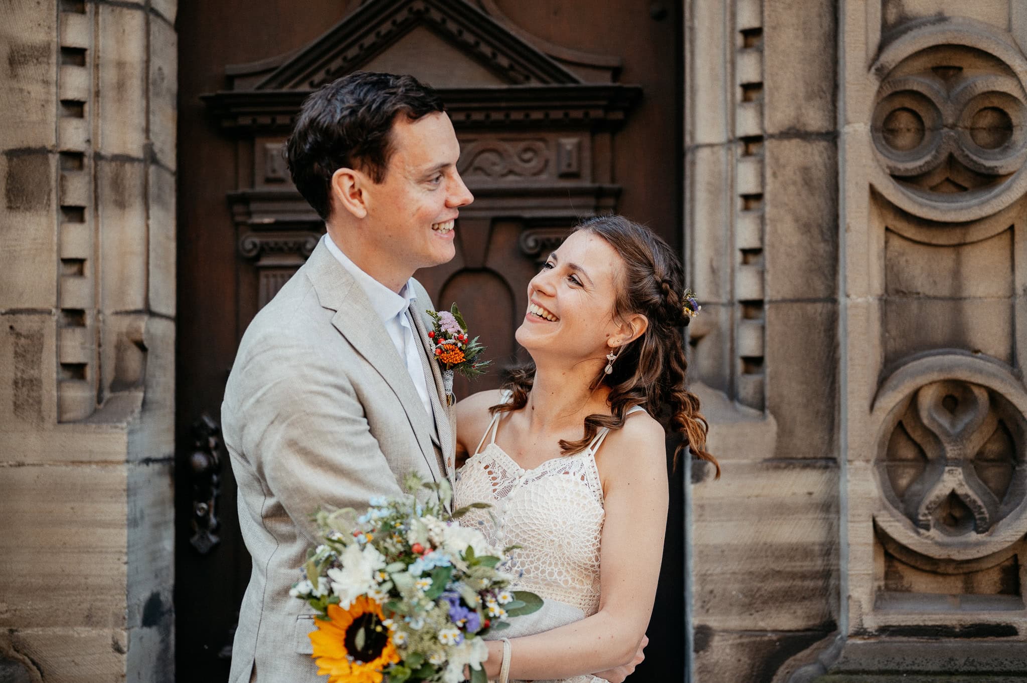 Für das Brautpaar war Duisburg-Mitte außerdem die perfekte Wahl, weil sie eine etwas größere Hochzeitsgesellschaft eingeladen hatten. Im Vergleich dazu fallen die Standesämter in Ratingen oder Düsseldorf deutlich kleiner aus und hätten diese Runde gar nicht aufnehmen können. So konnten sie ohne Kompromisse all ihre Herzensmenschen dabeihaben und gemeinsam diesen besonderen Moment feiern. Ich (Hannah) war wirklich überrascht, dass Duisburg so ein atmosphärisches Standesamt zu bieten hat – viel stilvoller, als man es erwartet. Eine absolute Empfehlung für alle, die sich ausschließlich standesamtlich trauen lassen und auf keine Gäste verzichten möchten.