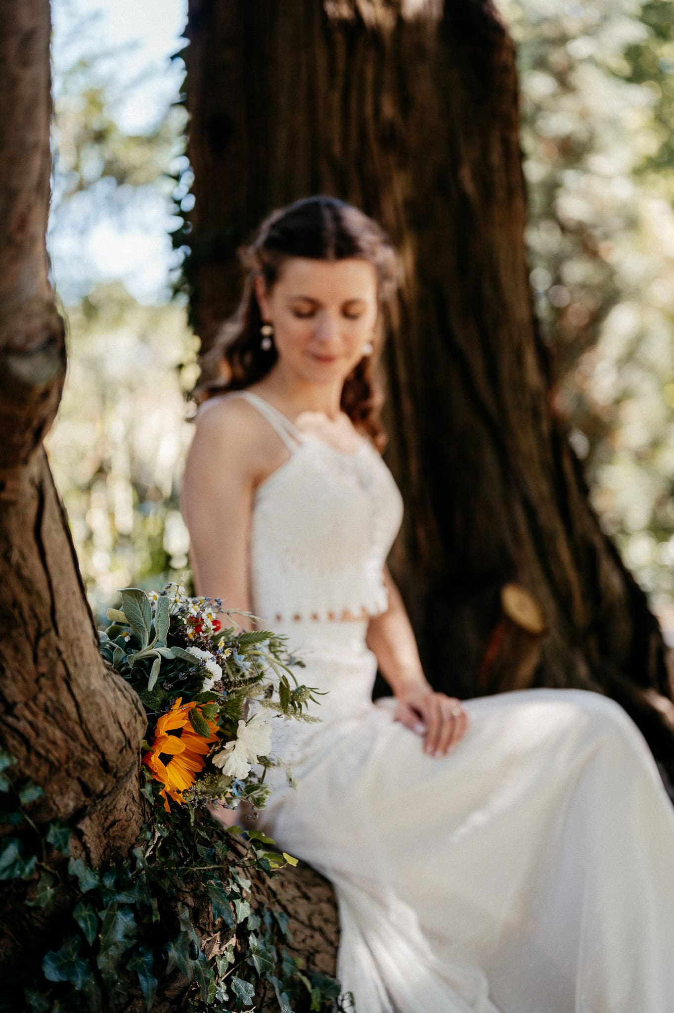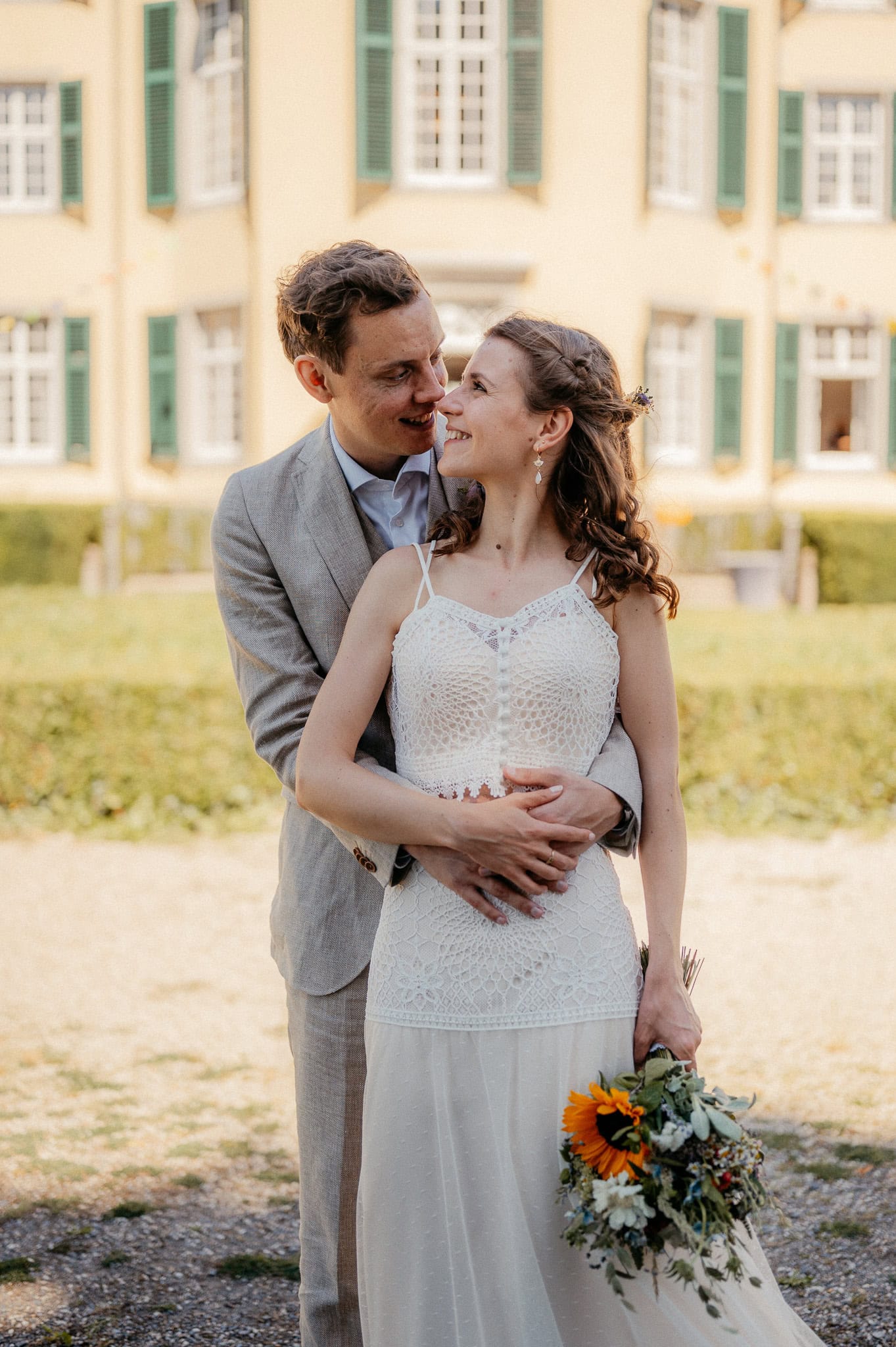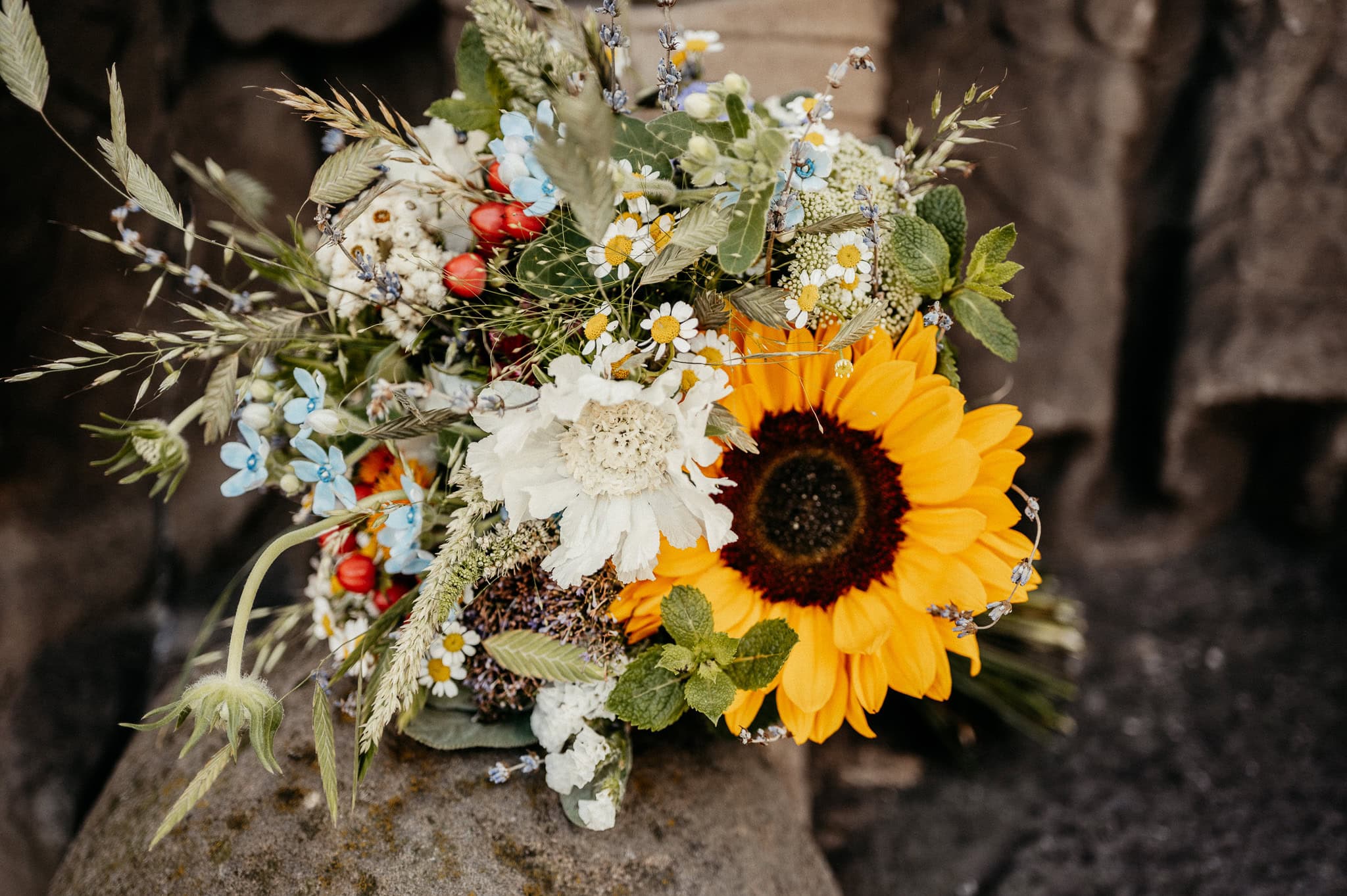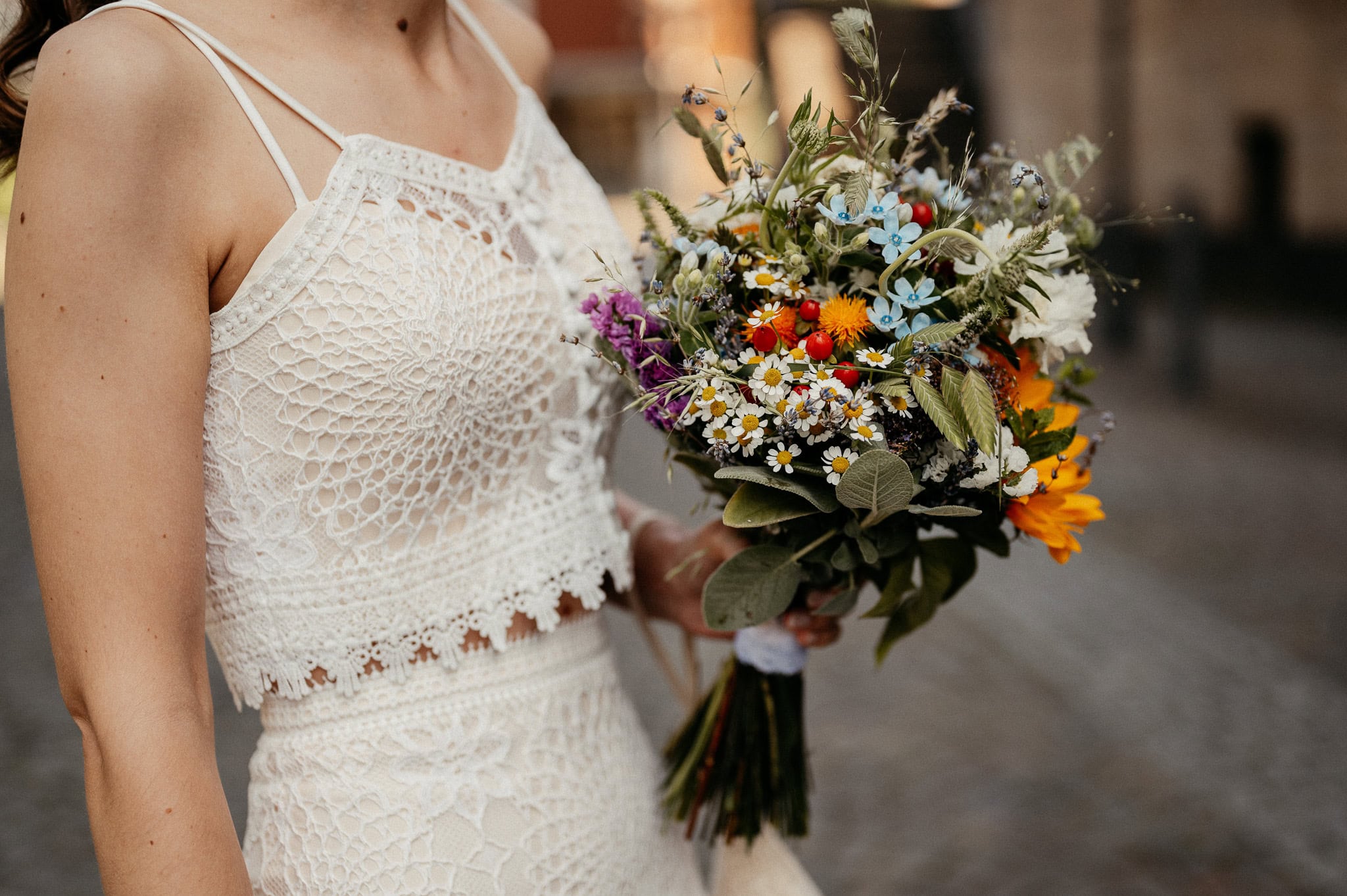 Die Braut trug einen wunderschönen Secondhand-Zweiteiler im Boho-Stil – locker, leicht und dabei unglaublich elegant, perfekt für eine sommerliche Hochzeit. In ihrem Haar waren hinten zarte Blumen eingearbeitet, die zusammen mit ihrem farbenfrohen Strauß aus Sonnenblumen und anderen Sommerblumen diese lässig-romantische Note noch unterstrichen.