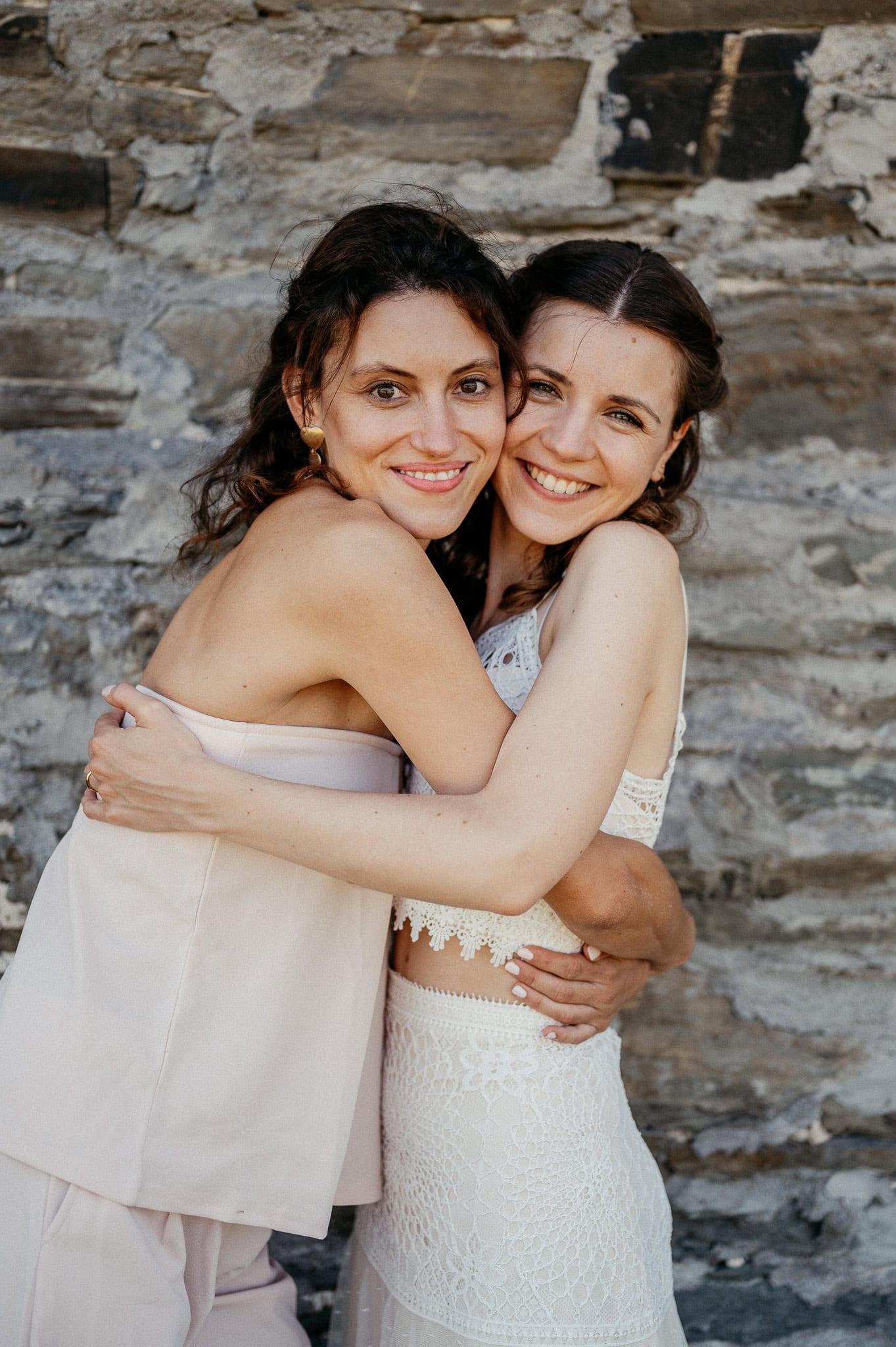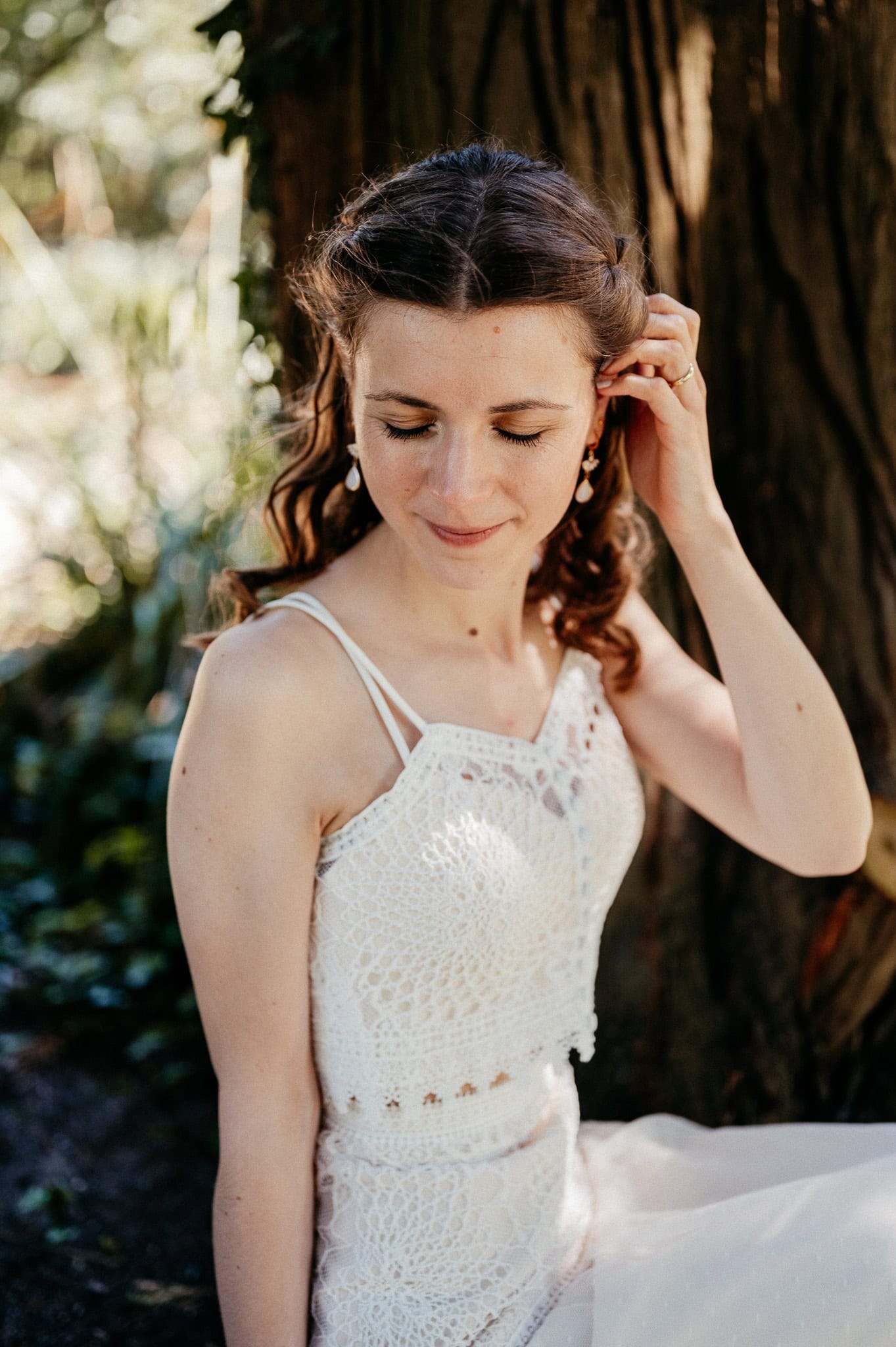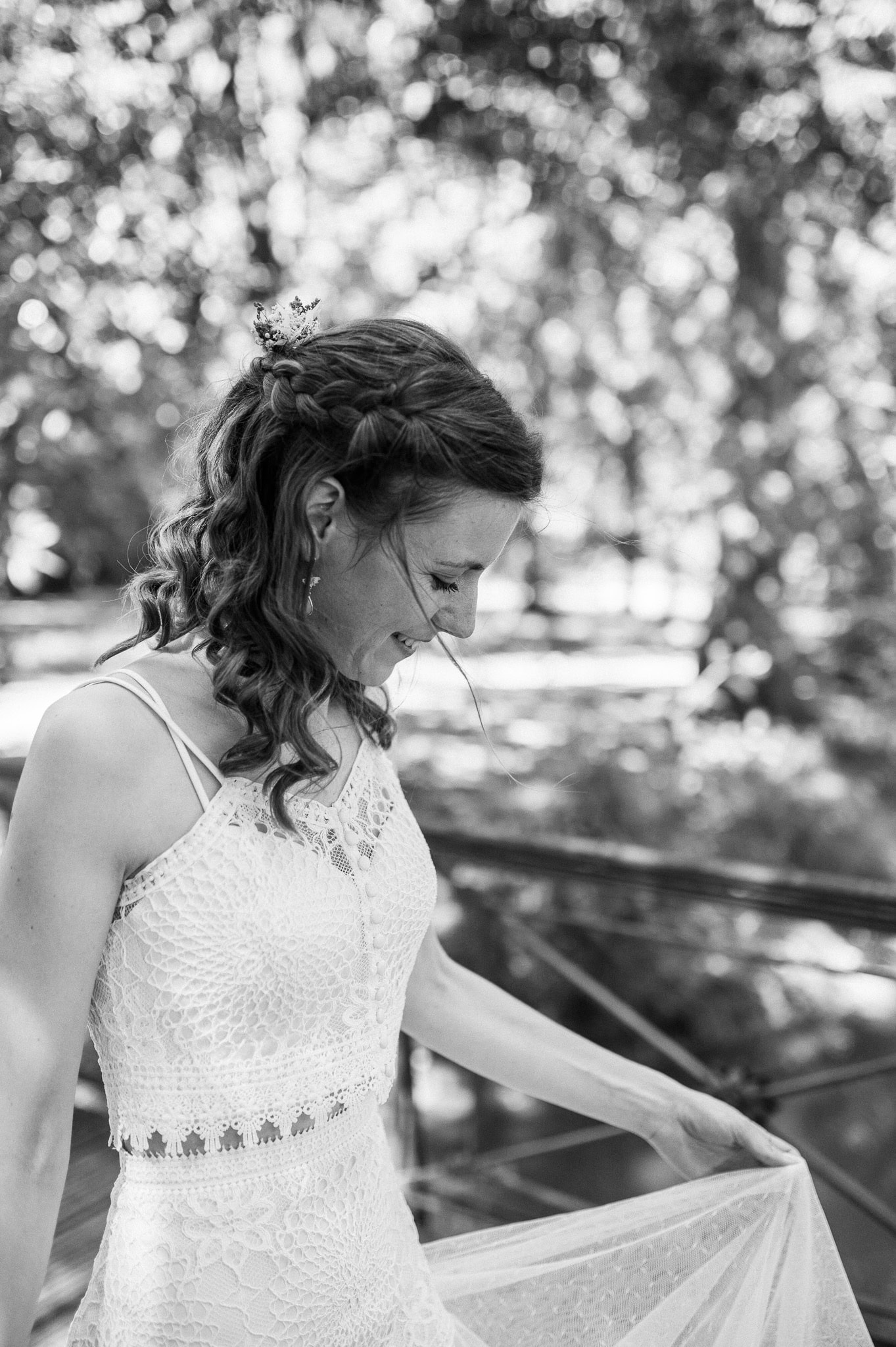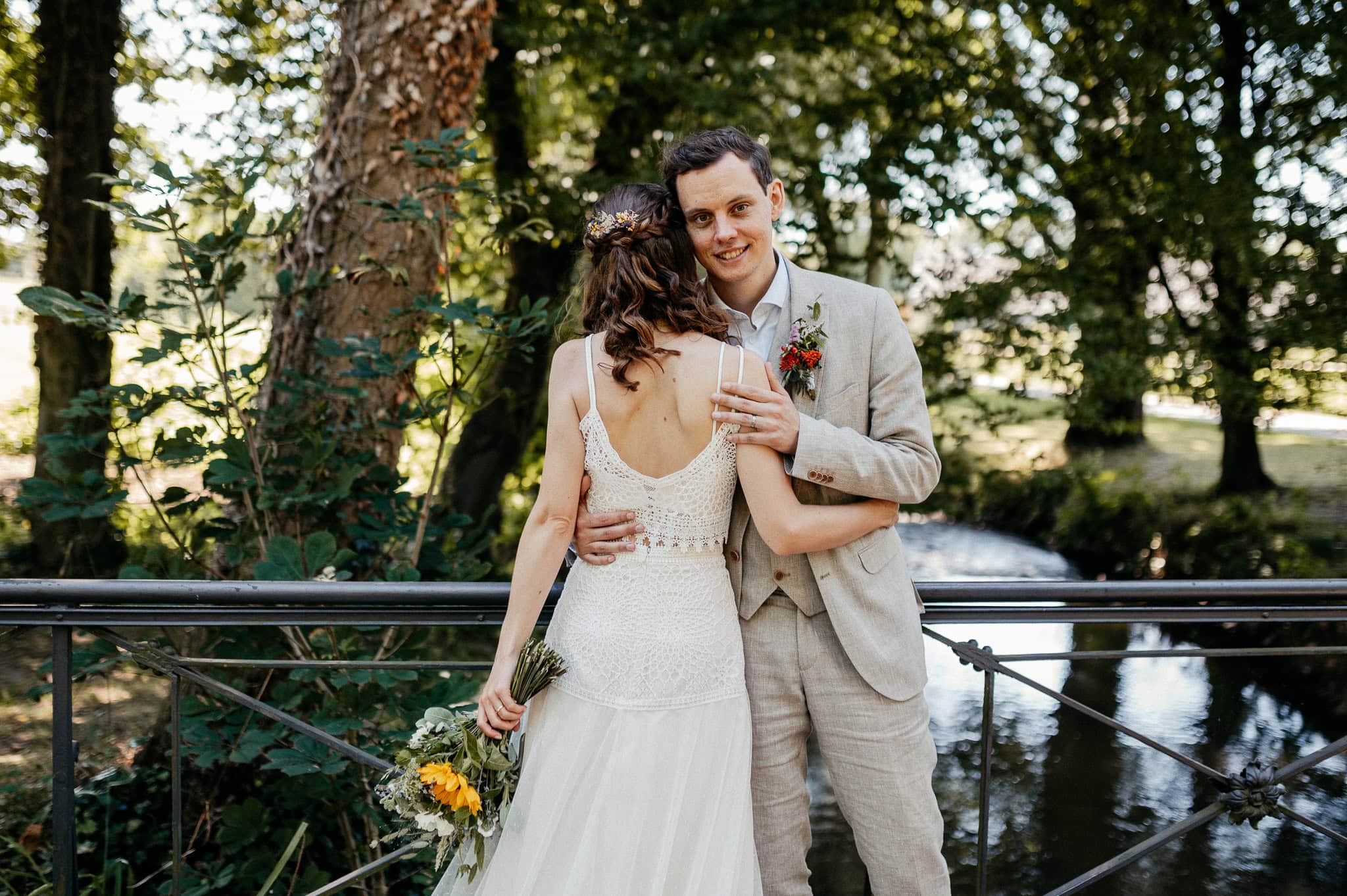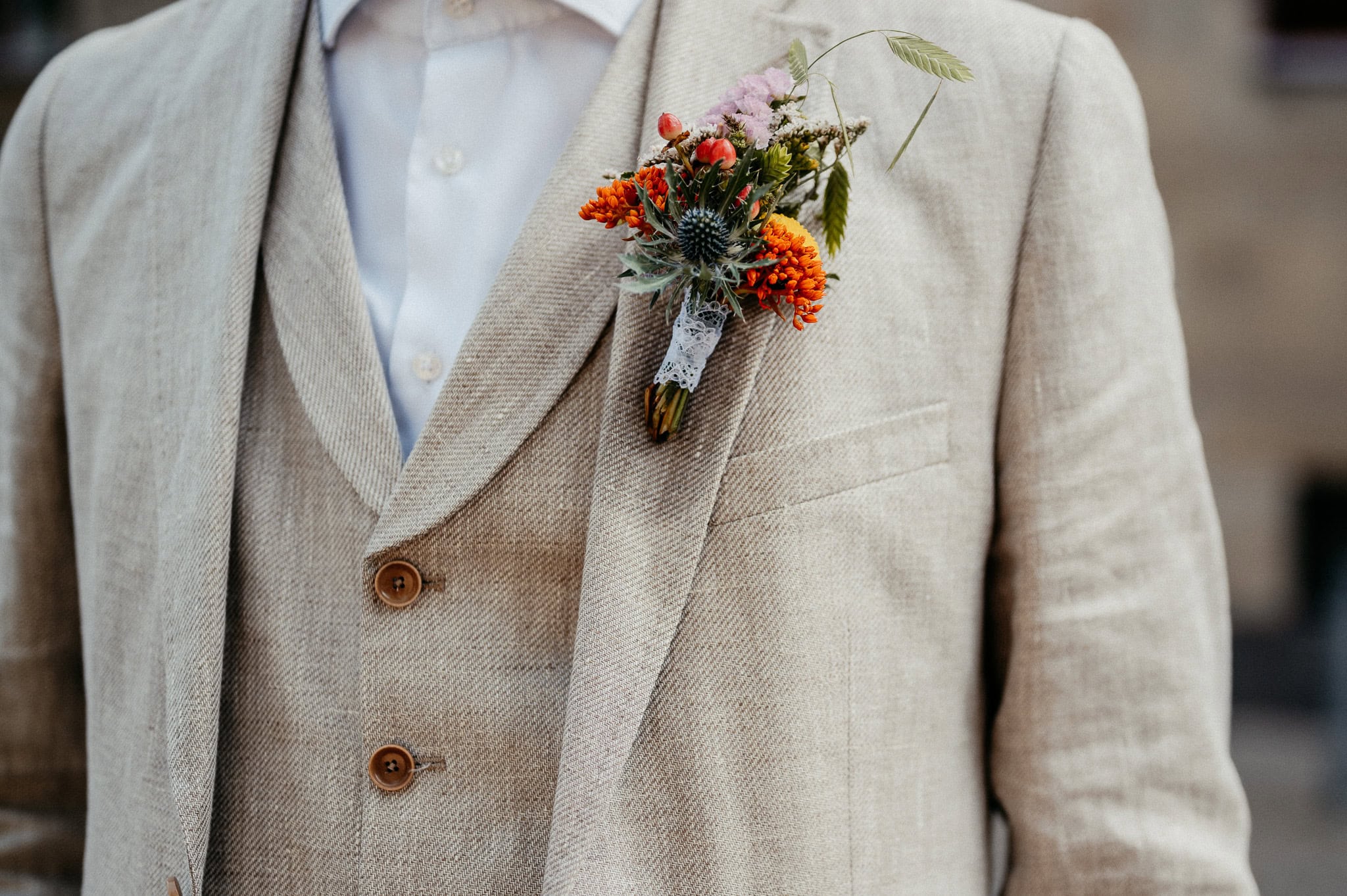 Die Braut trug einen wunderschönen Secondhand-Zweiteiler im Boho-Stil – locker, leicht und dabei unglaublich elegant, perfekt für eine sommerliche Hochzeit. In ihrem Haar waren hinten zarte Blumen eingearbeitet, die zusammen mit ihrem farbenfrohen Strauß aus Sonnenblumen und anderen Sommerblumen diese lässig-romantische Note noch unterstrichen.