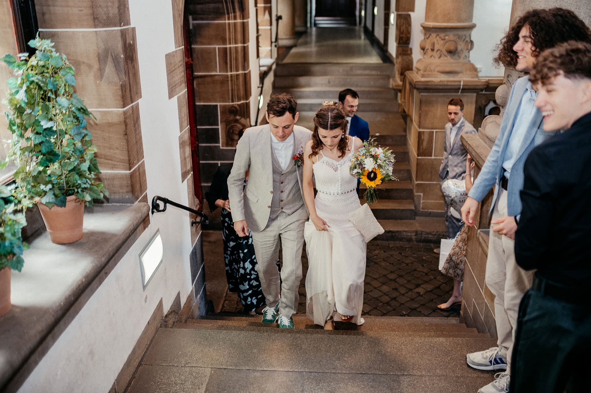 Nach der emotionalen Trauung ging es hinaus in den malerischen Burghof des Rathauses, wo unter freiem Himmel mit kühlem Sekt angestoßen wurde. Dort nahm das Brautpaar auch die herzlichen Glückwünsche und Umarmungen ihrer Gäste entgegen. Ein besonderes Highlight waren die Wedding Wands, die fast alle Gäste dabeihatten und damit für ein fröhliches, tanzendes Spalier aus Bändern sorgten, das das Brautpaar gebührend feierte. Es war ein lockerer, herzlicher Moment: kein großes Catering, keine Häppchen – einfach nur prickelnder Sekt, strahlende Gesichter, liebevolle Gratulationen und viele kleine Bänder, die in der Sommerluft wehten.